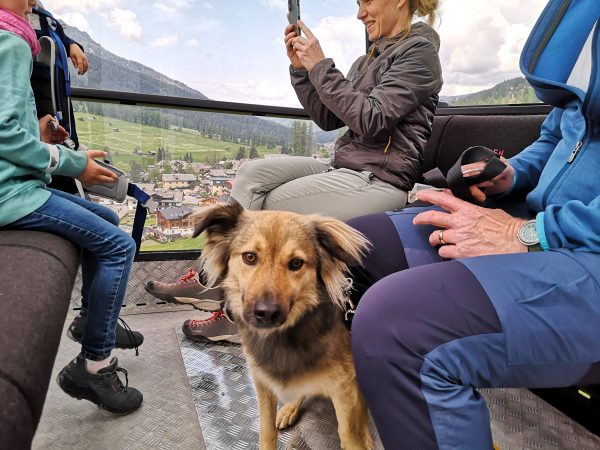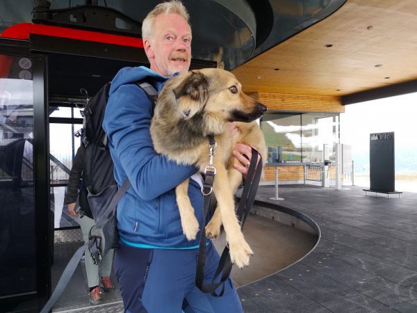 Amos wird aus der Gondel getragen, damit er mit seinen kleinen Pfoten nicht in den Zwischenraum zwischen Gondel und Plateau gerät. Für Hunde mit weniger besorgten Frauchen sollte der Ausstieg auf eigenen Beinen kein Problem sein. :-)