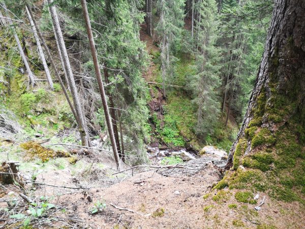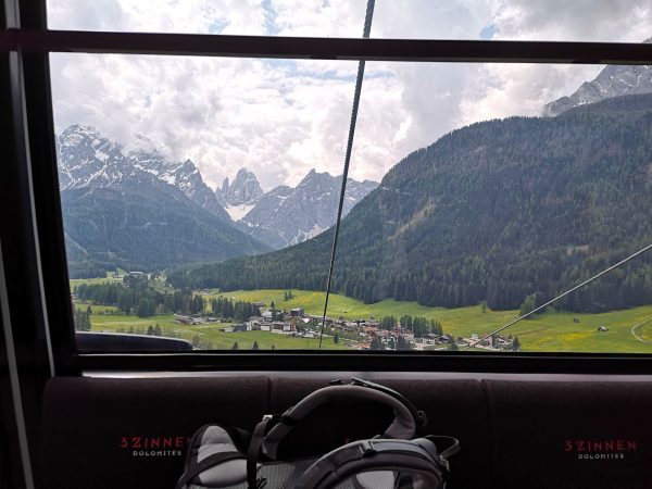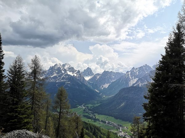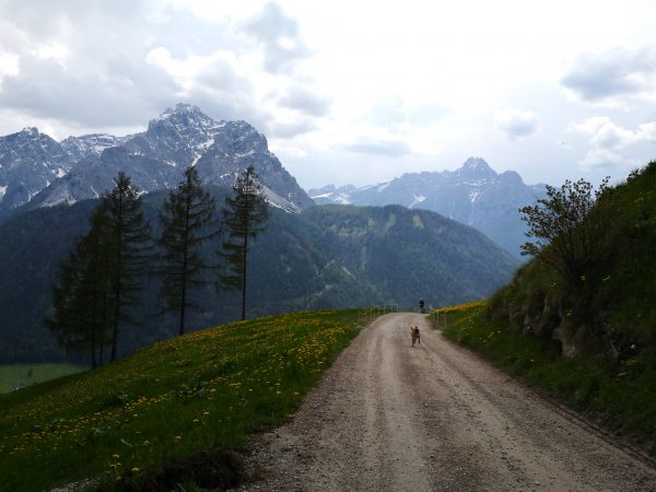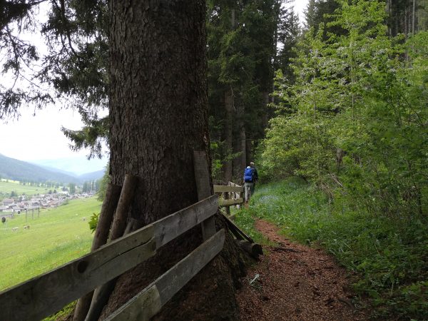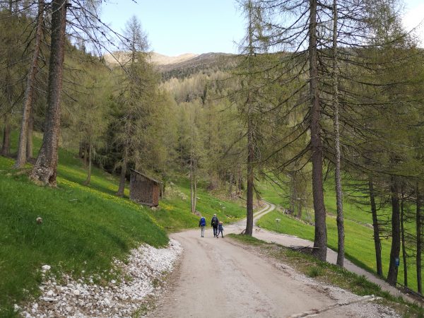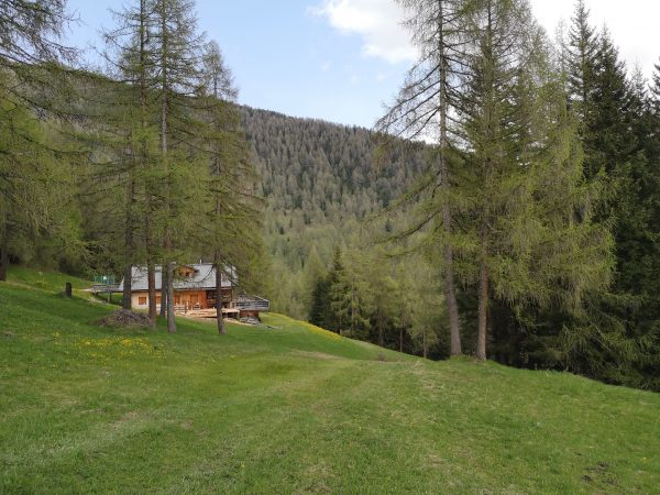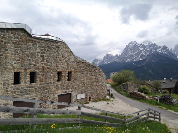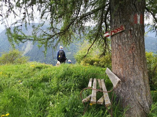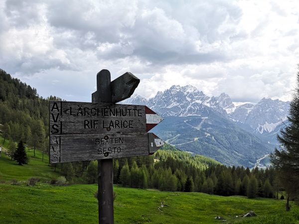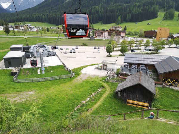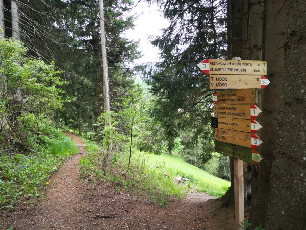 Nach einer Pause auf der großen Sonnenterrasse des Restaurants an der Bergstation geht`s den Helm hinab nach Moos zur Talsation – über die Lärchenhütte und die Festung Mitterberg. Kurz hinter dieser historischen Militäranlage biegt der Wanderweg Richtung Moos links von der Anliegerstraße ab und führt wenige Meter über das Gelände eines Bauernhofs. Die drei Hunde hier, zwei frei, einer angebunden, machen ordentlich Krach (nur Gebell, kein Geknurre), weichen aber sofort zurück. Wem das zu unheimlich ist, der folgt einfach weiter dem Anliegersträßchen bergab. Wir queren den Bauernhof, übersehen fast den Wegweiser an einem Baum. Wir folgen den im hohen Gras kaum sichtbaren Pfad den Berg hinab zum Wald. Nach einem kurzen wurzeligen Steilstück geht es sanfter absteigend durch den Wald, bis der Pfad auf den Sextener Rundweg trifft. Rechts ab und weiter auf dem schönen Höhenweg am Waldrand. Dann noch ein kurzes Stück über die Anliegerstraße, die Treppe hinab und wir erreichen den Parkplatz an der Talstation.