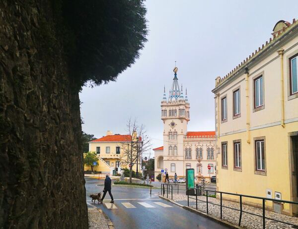 Wir erreichen einen Kreisverkehr, daran ein Zuckerbäckergebäude mit auffälligem Uhrturm: die Câmara Municipal de Sintra. Das Rathaus von Sintra, fertiggestellt 1909, gilt als beeindruckendes Beispiel für die romantische Architektur Sintras.