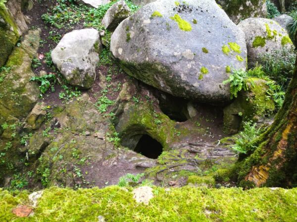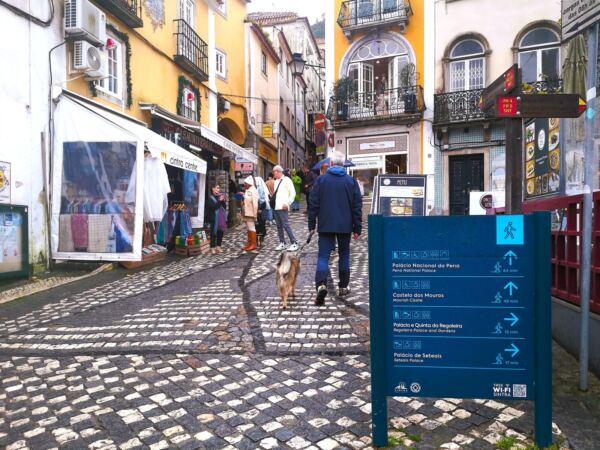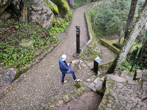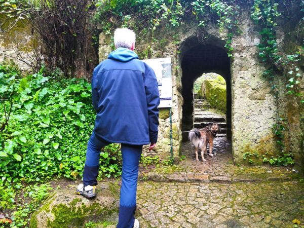 Unser Wanderweg bringt uns durch die Altstadt von Sintra mit ihren vielen Souvenirshops, Restaurants und „Pasteis de Nata“-Bäckereien. Schließlich folgen wir dem alten gepflasterten Caminho de Santa Maria durch die Wälder und alte Steintore zu Maurenschloss und Palast. Auf dem Caminho de Santa Maria, ausgestattet mit Kotbeutelspendern, gilt Leinenpflicht. Wir hatten unseren Amos an der Flexi, damit er ein wenig toben konnte. Er hat die Tour trotz Leine genossen, weil es entlang des Wegs viel Grün und sehr viel Spannendes zu entdecken gibt, darunter die „Silos“, tiefe Löcher im Boden, in denen die Mauren einst Getreide und Gemüse lagerten. Unterwegs mehr Baumschatten als Sonne.