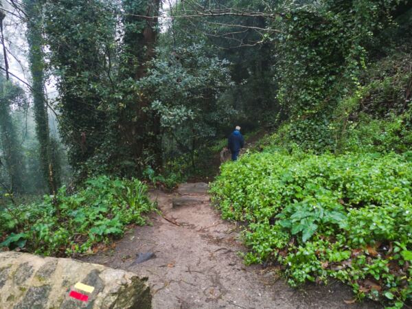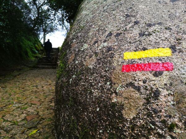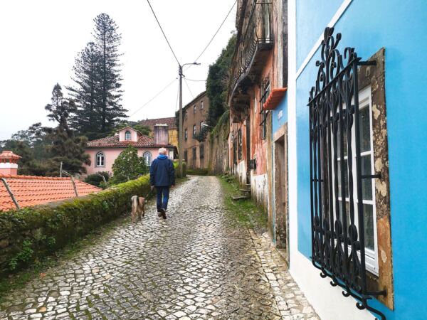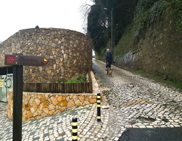 Wir steigen eine Treppe in eine Gartenanlage hinab. Hier laufen wir auf dem Fußweg parallel zur Volta da Duche. Hinter dem Museum der beiden Bildhauer Teixeira mündet der Fußweg wieder auf die Volta da Duche. Wir erreichen den Palácio Nacional de Sintra. Davor halten wir uns links und schlendern durch die kleinen Gassen bergauf. In Zweifelsfällen halten wir uns immer links. Über die Rua das Padarias und Rua da Ferraria erreichen wir die Rua Marechal Saldanha. Die enge Straße, links und rechts von Häusern und Mauern begrenzt, hat leider keinen Bürgersteig. Zur Hauptsaison möchten wir hier nicht mit Hund unterwegs sein. Zum Glück brauchen wir aber nur ein paar Schritte bergauf. Dann biegt der gepflasterte Fahr- und Fußweg Calcada dos Clerigos rechts ab. Wir folgen ihm. Hier können wir unserem Amos nun auch mehr Spiel an der Flexi lassen. Hinter der alten Kirche Santa Maria und dem rosa Haus, in dem Hans Christian Andersen während seiner Portugalreise 1866 gelebt habt, biegt scharf rechts die Rampo do Castelo ab. Sie bringt uns zu einem steinernen Tor, dem Beginn unseres Wanderwegs Caminho de Santa Maria.