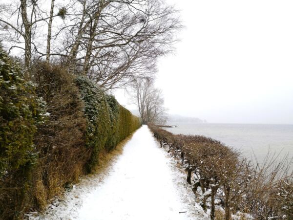 Wir folgen der Nördlichen Seestraße nahe des Ufers Richtung Ammerland, passieren die Fischerei Sebald und erreichen Schloss Ammerland mit seiner Kapelle.