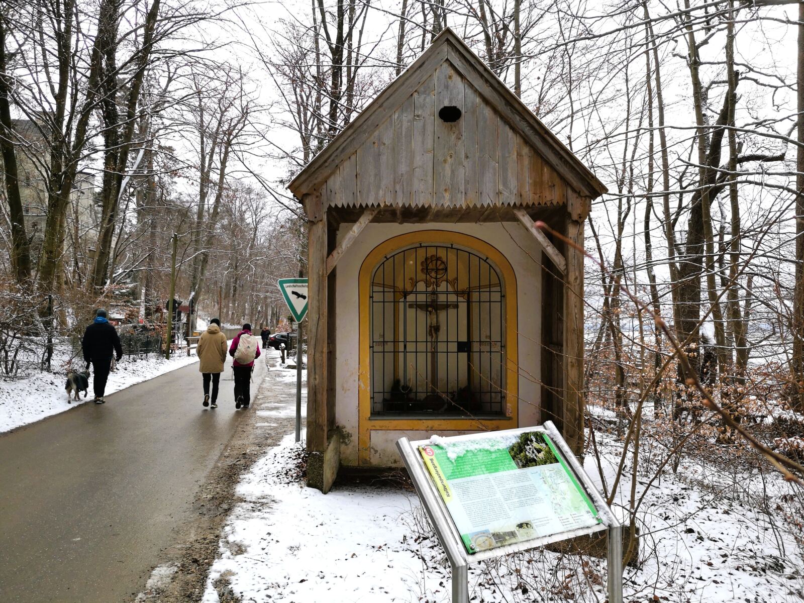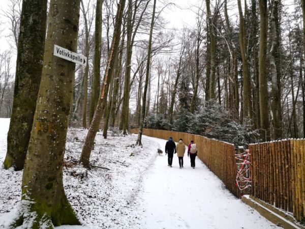 Ein Wegweiser führt uns schließlich Richtung Votivkapelle. Über einige Stufen steigen wir bergab zur Kapelle und weiter zum Kreuz im See.