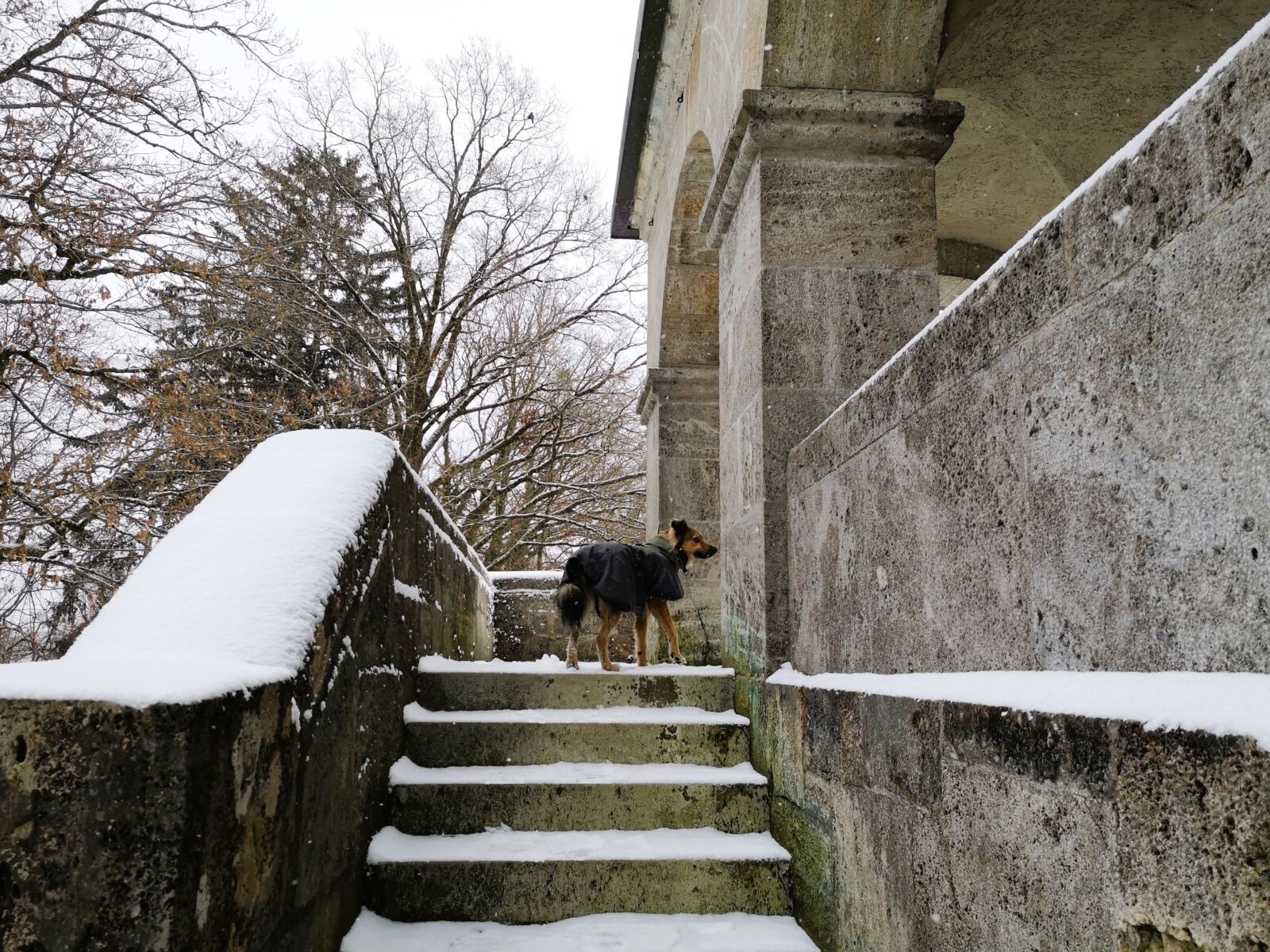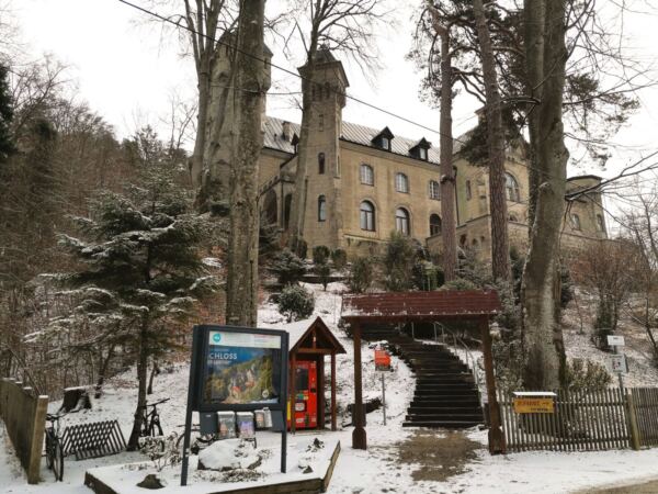 Wir verlassen den Turm und folgen dem Weg, der uns rasch zum Waldrand bringt, dann bergab durch den Wald. Durch die unbelaubten Bäume sehen wir bald die gelben Mauern von Schloss Berg und einen Zipfel des Sees.