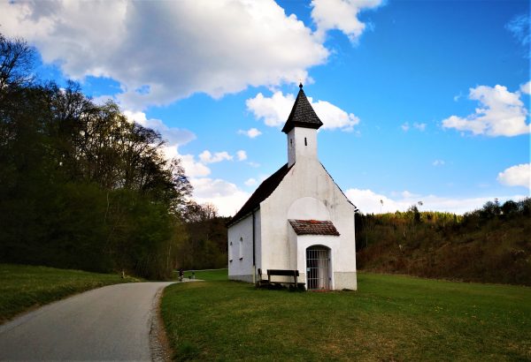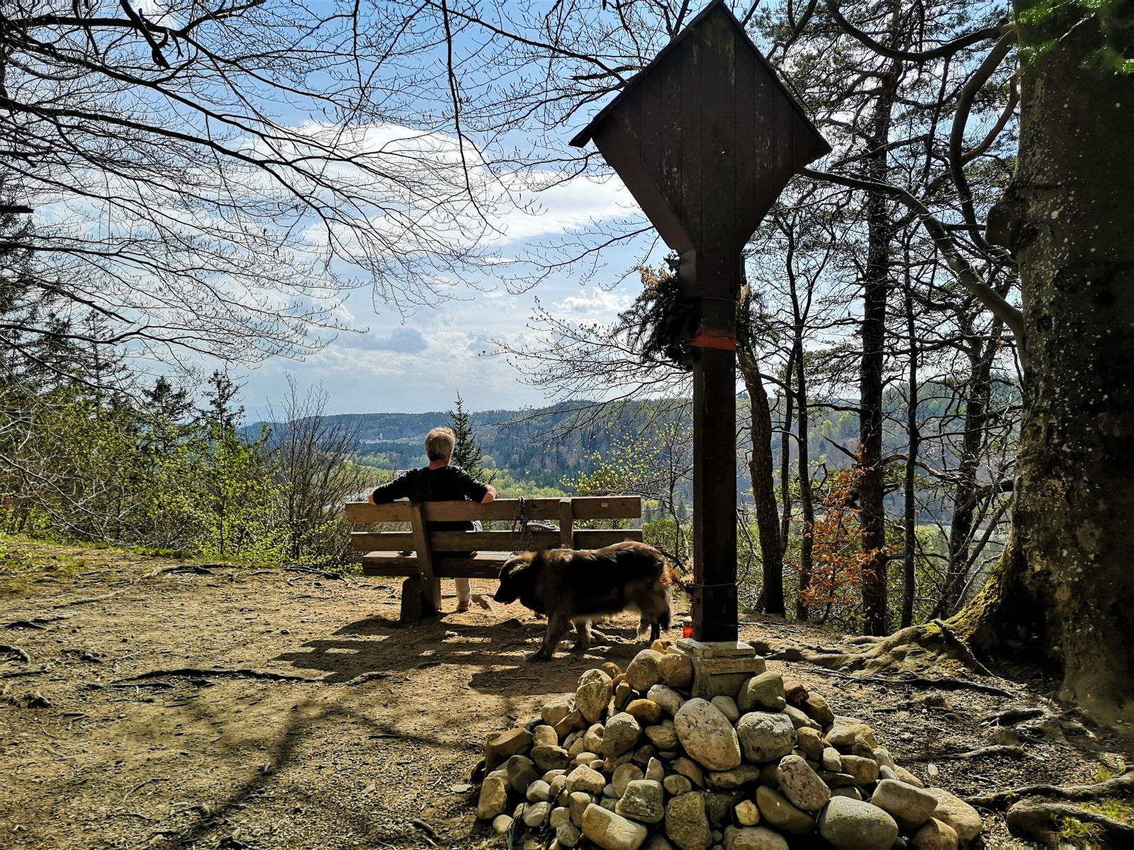 Leckerchenpause am Isarblick. Im Hintergrund das Wegmarterl.