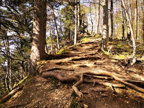 Steiler Abstieg über Wurzelpfade hinab zur Isar.