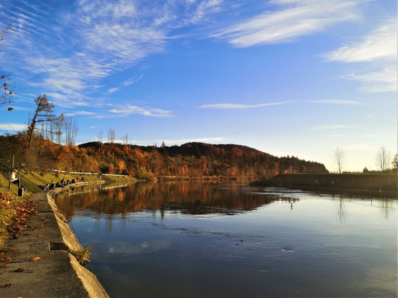 Herbststimmung am Isarwerkkanal: Spaziergänger genießen die letzten Sonnenstrahlen des Tages. Bei klarem Wetter sieht man von hier aus die Zugspitze.