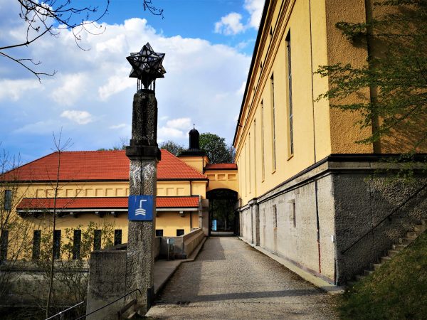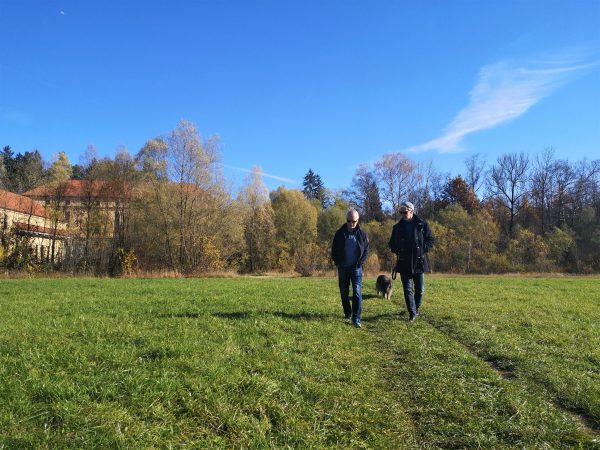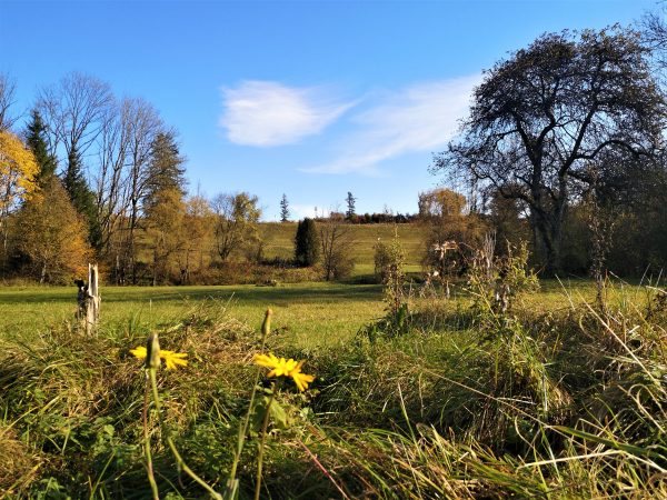 Blick über die Wiese hoch zum Isarwerkkanal.