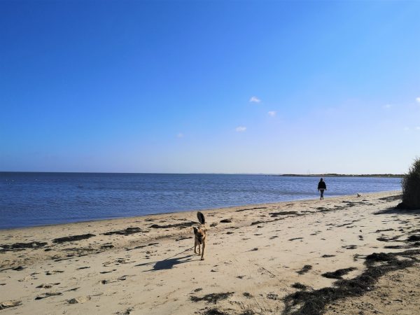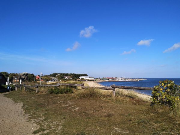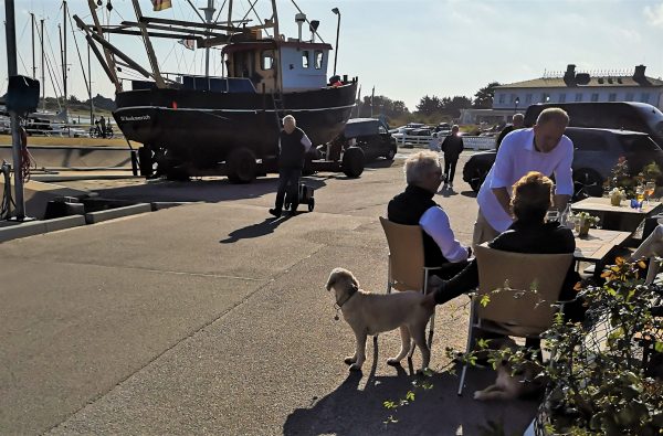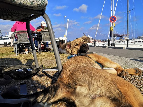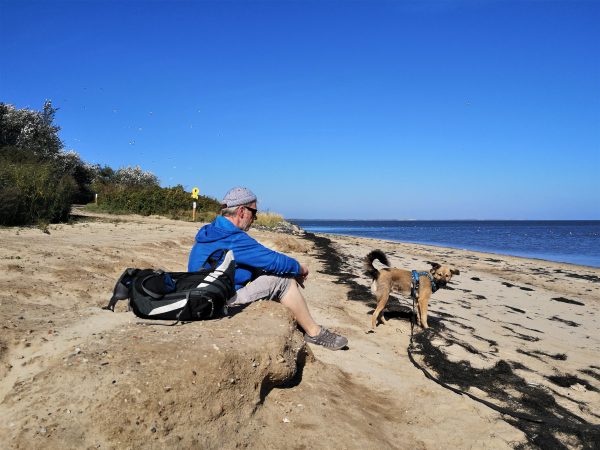 Unterwegs legen wir einen Zwischenstopp in der „Hafenkneipe“ (Heefwai 2) im Munkmarscher Hafen ein. Superentspannt mit Hund. Die Wirte haben selber welche. Viel Sonne, kein Schatten. Und unter Füßen und Pfoten  ab der Baderuper Heide nur Sand- und Strandpfade. Wir waren mit der Schleppleine unterwegs.