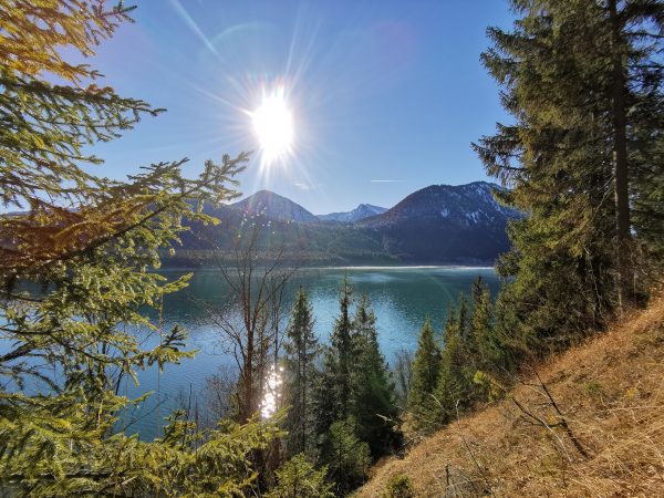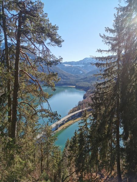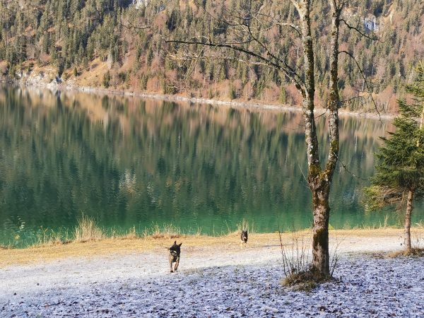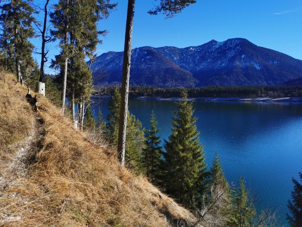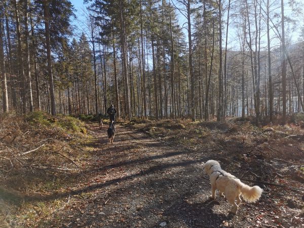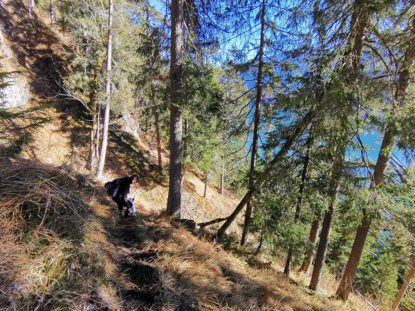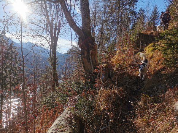 Nach mehr als der Hälfte der Strecke rund um den See kommt man auf einen schmäleren Weg, der überhalb des Sees rauf und runter führt. Achtung : Der Weg ist so schmal, dass man nicht nebeneinander gehen kann. Links geht es steil nach oben, rechts steil nach unten… Wir waren daher froh, niemandem zu begegnen, der Angst vor Hunden hat und an uns vorbei musste.