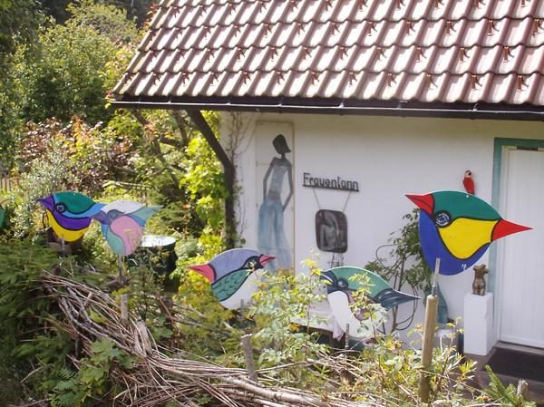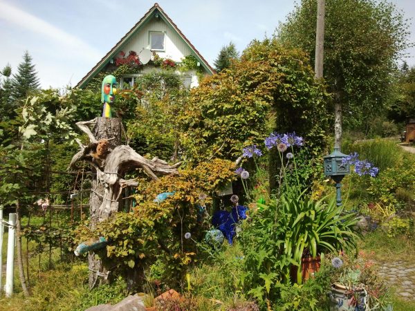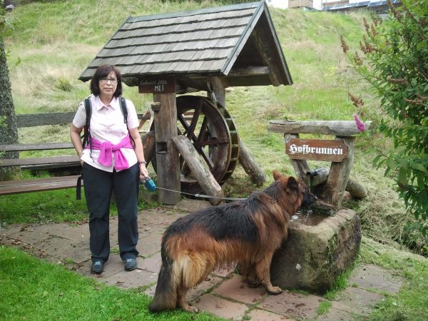 Der hervorragend ausgeschilderte Heimatpfad führt ein Stück entlang eines Waldwegs, dann als schmaler Pfad links weg, über einen Bach und wieder nach oben. Weiter geht es durch den Garten des Hotels Waldblick, vorbei am Hotel und danach bald rechts weg. Wir kommen an einigen alleinstehenden Häusern vorbei – alle mit sehenswerten Gärten, dann geht es wieder in den Wald.