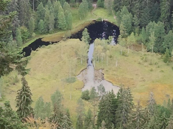 Startpunkt ist am kostenlosen Parkplatz des Besucherzentrums von Kniebis, direkt an der B 28. Wir wechseln die Straßenseite und gehen links. Der Heimatpfad, über weite Strecken tatsächlich ein toller Pfad, führt zunächst entlang der B 28, die wir bald überqueren, aber in respektvollem Abstand zunächst noch ein wenig begleiten. Dann führt uns der Eichelbachweg bergab, vorbei an einem Moorbad links unten im Tälchen.