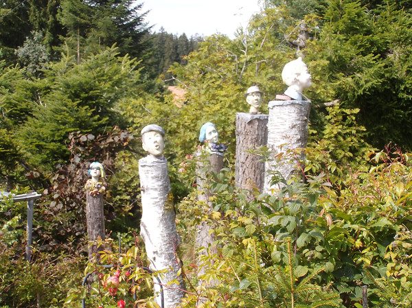 Wir erreichen die Aussichtsplattform des Ellbachseeblick, die wirklich grandios ist. Linkerhand zeigen sich Schliffkopf und Ruhestein, rechts der Windpark Simmersfeld. Von der Hütte gehen wir links, bis zur Forbachquelle leicht bergab und dann wieder bergan. Wilde Figuren begleiten uns im Wald, Reh, Hase und Fuchs auch. Und immer wieder auch, wie eigentlich schon auf dem ganzen Heimatpfad, hölzerne Kunstwerke. Das Räuberwegle führt uns nun bis zum Skistadion, das wir passieren und bald schon am Ausgangspunkt unserer Wanderung zurück sind.