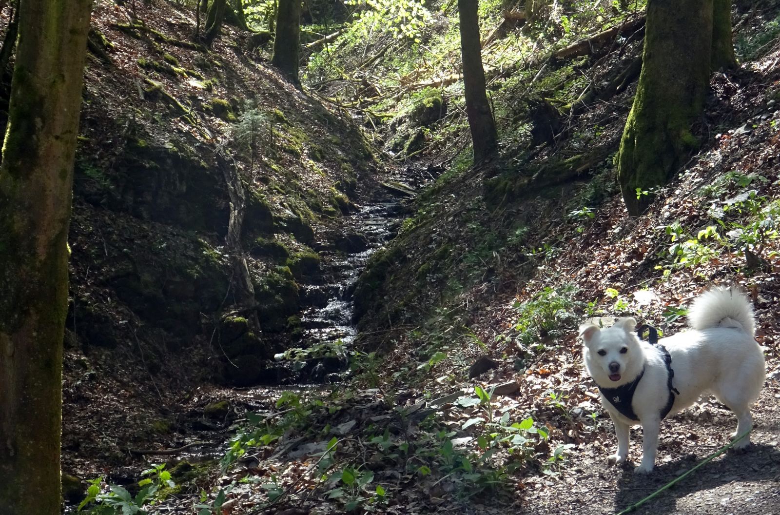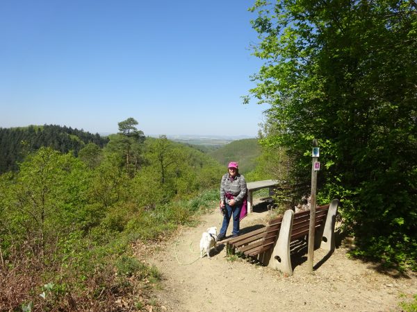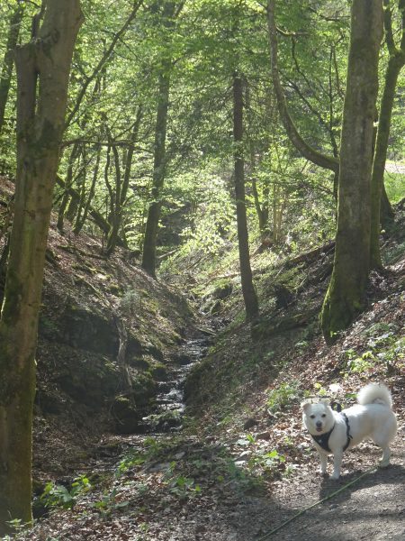 In einer weiten Schleife nimmt der Weg wieder Kurs auf Herschwiesen, um dann in das Tal des Brodenbachs hinab zu führen. Hier zeigt der Weg dann ein anderes Gesicht und führt über längere Zeit am Brodenbach vorbei. Spätestens hier lädt der kühle Bach dazu ein Füße und Pfoten zu erfrischen. Im Schatten gönnt man sich und seinem Vierbeiner hier eine Rast, bevor es dann bergauf geht. Der Weg führt uns bergan zum nächsten Zwischenziel: Der Udenhausener Schweiz.