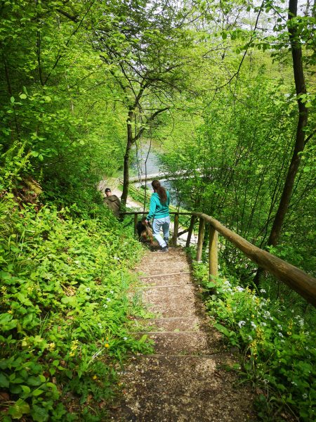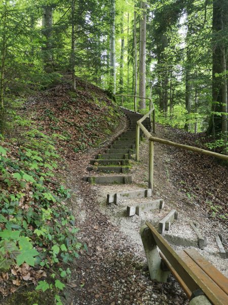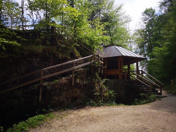 Nach einer kleinen Brücke kommen wir am Klobenstein vorbei, an der sich eine kleine Kapelle schmiegt. Wir erklimmen kurz die Treppe auf den Felsen und weiter geht’s am Fluss entlang.
