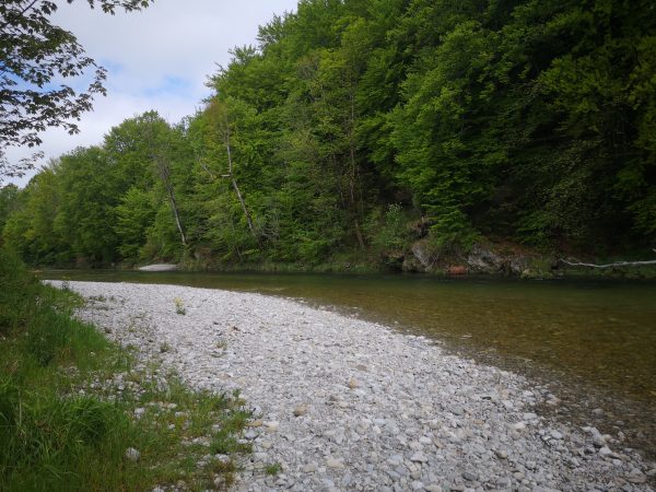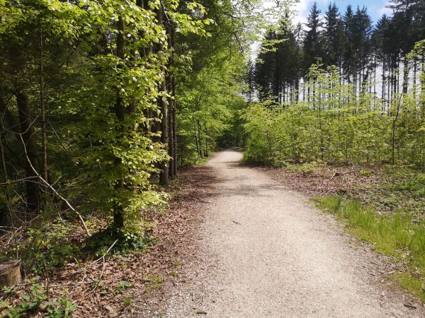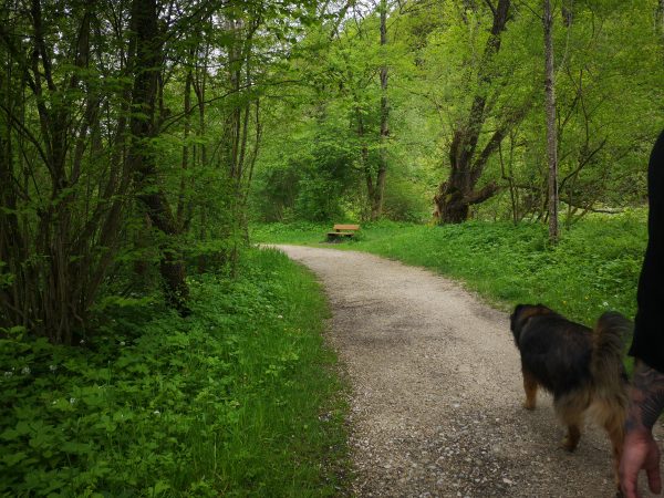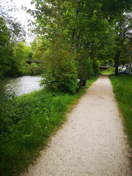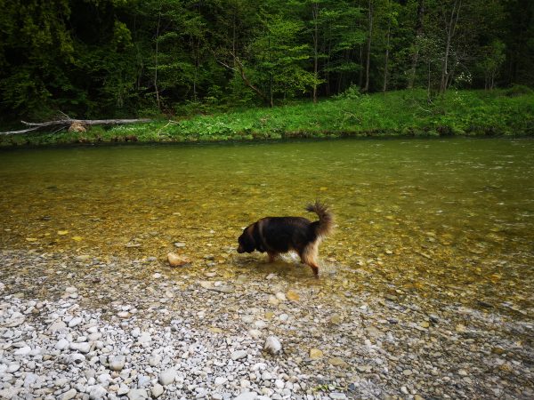 Wir starten am Schulzentrum an der Wasserburger Straße, von dort geht es zum Hang und dann über eine Stelle Treppe runter zur Traun. Dieser folgen wir jetzt, durch Empfing und dann bergauf, bergab immer weiter durch den Wald. Bruno findet regelmäßige Badeplätze.