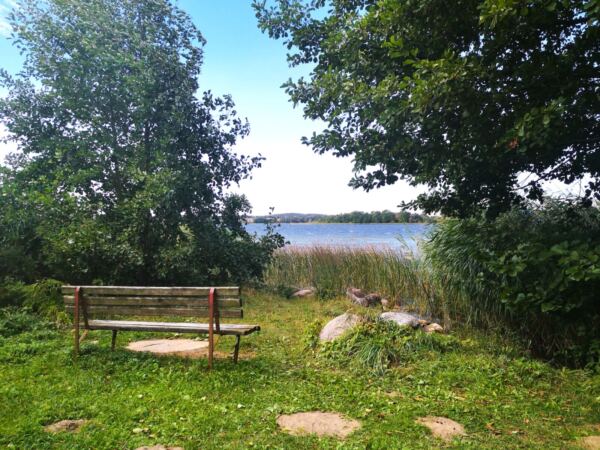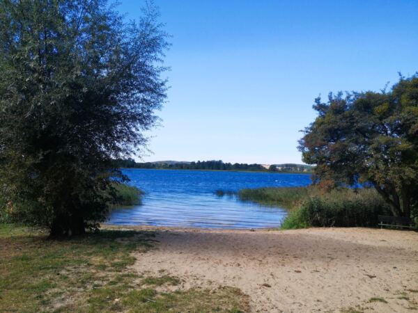 Wir starten an der Badestelle von Warnitz. In der Badesaison sind Hunde am Strand und auf der Liegewiese nicht gestattet.