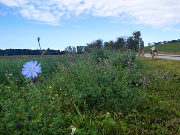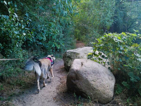 Wir lassen die Badestelle rechts von uns liegen und folgen dem Wanderweg zwischen Wald und See. Der verjüngt sich bald und bringt uns wenig später zum kleinen Bootsliegeplatz mit Steg. Die erste Möglichkeit für eine Planschpause. Amos nutzt sie natürlich. Wir laufen immer geradeaus und kommen zum Badesteg des Campingplatzes. Weiter geht es auf dem schmalen Uferpfad entlang. Schließlich erreichen wir das Anwohnersträßchen Turnersruh in einer Ferienhauskolonie. Auf dem Sträßchen Am Wald kommen wir auf die Hauptstraße Lindenallee. Dieser Plattenweg ist kaum befahren. Und weil Amos noch ein wenig toben möchte, folgen wir der Lindenallee, die rechts und links der Platten genug Grün zum Entdecken bietet.