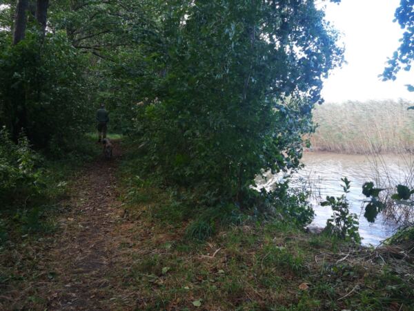 Im Biosphärenreservat Schorfheide-Chorin im Nordosten Brandenburgs liegt der Oberuckersee, eingebettet in sanfte, licht bewaldete Hügel, die die Eiszeit geformt hat. Mit rund 690 Hektar Wasserfläche ist er der zweitgrößte See am Lauf der Ucker. Ein Paradies für Paddler, Schwimmer, Kraniche, Nachtigallen, Eulen – und Menschen, die die Ruhe lieben. Denn Schiffe mit Motor sind auf dem Oberuckersee nicht erlaubt. Ruhig geht es hier wohl auch deshalb zu, weil man nicht um den meist schilfbestandenen See spazieren kann. Doch wer wie wir das Glück hat, auf dem sehr schönen Naturcampingplatz „Camping Oberuckersee“ in Warnitz eine Nacht und mehr zu verbringen, kann mit Hund wunderbar einen kleinen Spaziergang am Ufer machen. Entweder man startet direkt am Badesteg des Campingplatzes oder wie wir an der offiziellen Badestelle in Warnitz. Der Liegewiese bleiben wir fern, auch wenn die Badesaison schon vorbei ist.