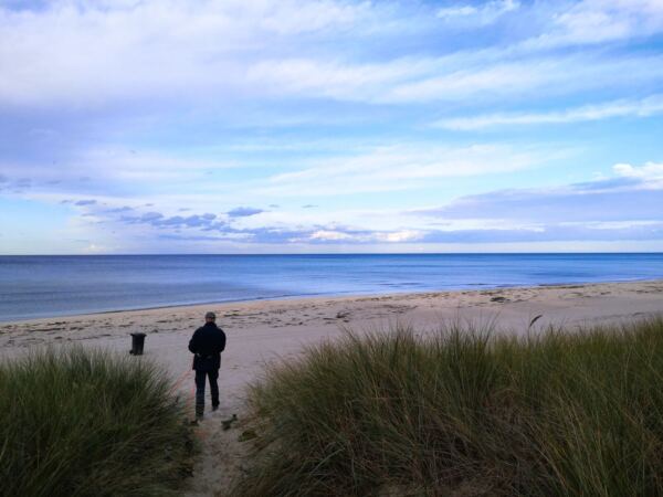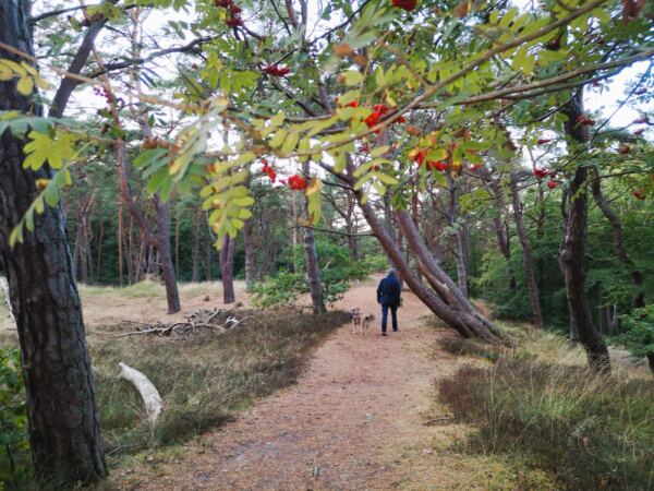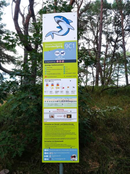 Wir verlassen den Campingplatz durch das Tor Richtung Strand und halten uns rechts. Nach wenigen Metern durch den Wald erreichen wir den Strandabgang 9C1, der als FFK und Hundestrand gekennzeichnet ist (reiner Hundestrand ohne FKK: 9C4 bis 9C2). Jetzt, Mitte September, gibt`s hier kaum noch Badende, schon gar nicht hüllenlos.