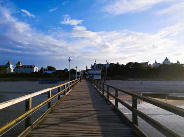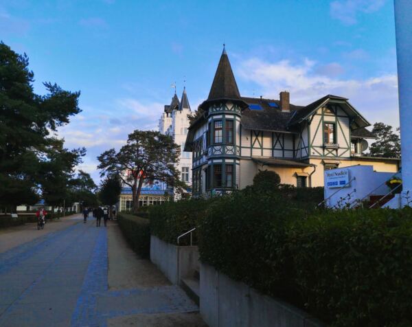 Über den fast weißen, feinsandigen Hundestrand laufen wir weiter Richtung Zinnowitz. Die lange Seebrücke mit der Tauchgondel in Meerjungfrau-Türkis sehen wir schon von hier aus. Wir verlassen den Strand einen Abgang später. Es geht weiter geradeaus durch den Wald. Verlaufen unmöglich. Schließlich erreichen wir die Promenade. Wir passieren das „Baltic“, das größte Hotel Usedoms, das der SDAG Wismut einst als Ferienheim „Roter Oktober“ diente.  Und dann schlendern wir an Perlen der Bäderarchitektur vorbei. Besonders schön zum Beispiel das Palace Hotel mit seinen Türmchen und das liebevoll restaurierte Haus Schwalbennest, erbaut 1895, mit seinen Holzschindeln. Hier dürfen auch Hunde übernachten. Über die Strandpromenade gelangen wir zur Seebrücke. Wir laufen vor, genießen den Blick zurück und übers Meer.