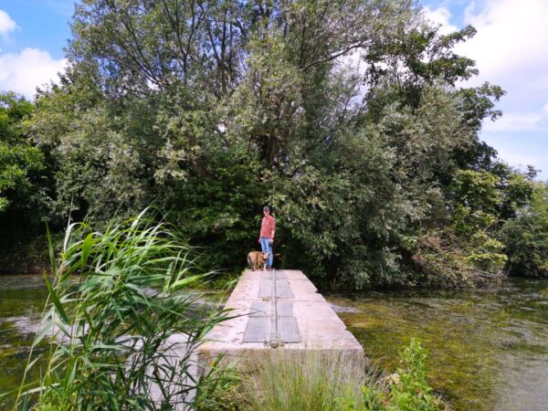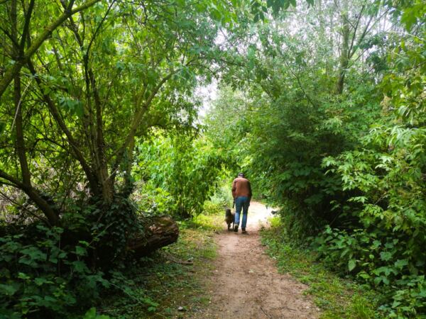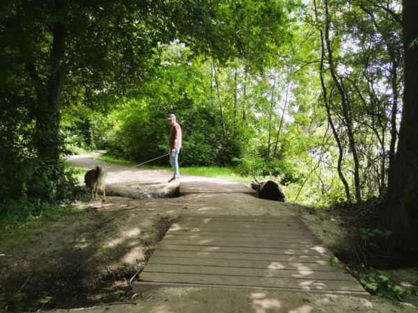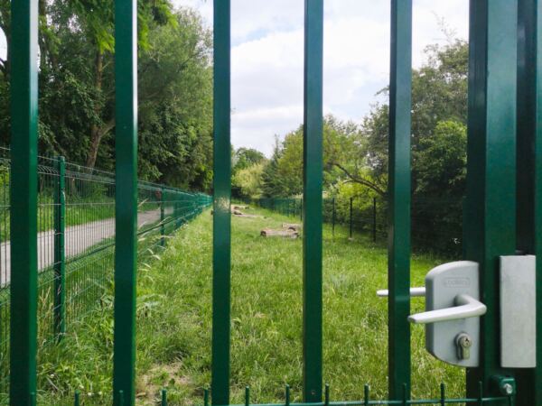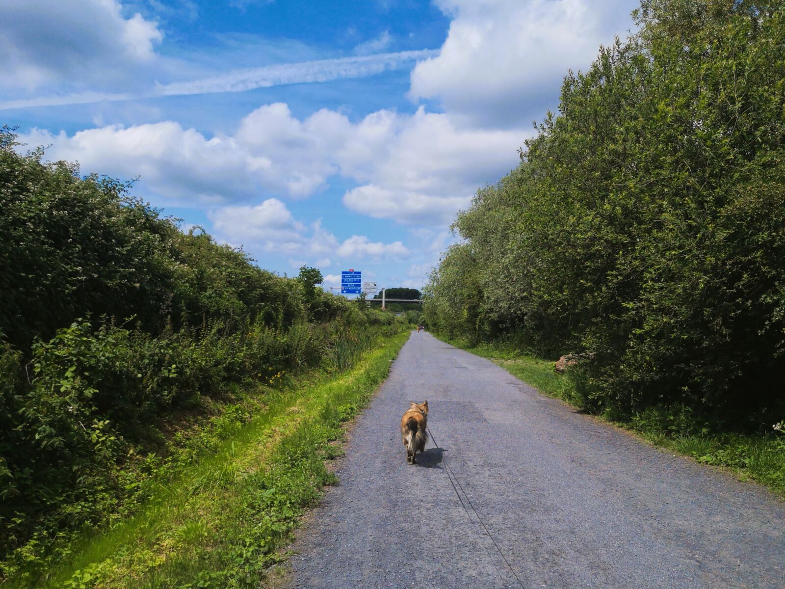 Nach einer Weile erreichen wir wieder bewohnte Gebiete. Linker Hand fällt ein eingezäunter Hundepark auf – ausgeschildert und ideal für eine kurze Freilaufrunde. Wir halten uns an dieser Stelle rechts und passieren einen schmalen Durchlass, der nur für Fußgänger und Radfahrer zugänglich ist.