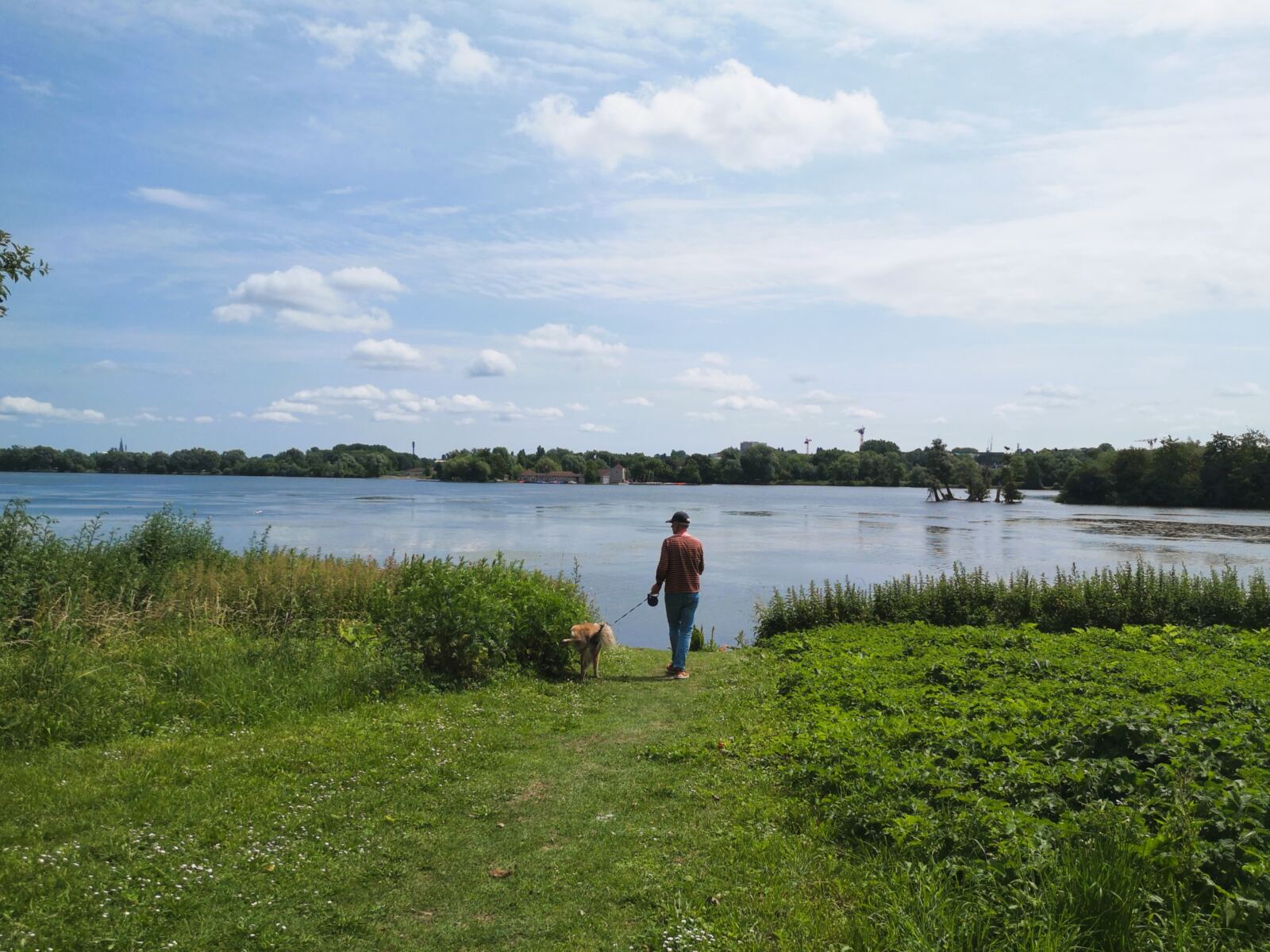 Die Tour führt uns um den Étang du Vignoble im Süden von Valenciennes – eine grüne Oase nur wenige Minuten vom Zentrum entfernt und nahe der Autobahn. 🚗🌿🐾 Der knapp 55 Hektar große See liegt eingebettet zwischen Stadt, Schelde-Kanal und Feldern und ist ein beliebtes Naherholungsgebiet für Menschen mit und ohne 🐕. Die Stadt selbst, gelegen im Département Nord in der Region Hauts-de-France, rund acht Kilometer westlich der belgischen Grenze, war einst ein Zentrum für Kohl und Stahl und kämpft mit dem Strukturwandel.