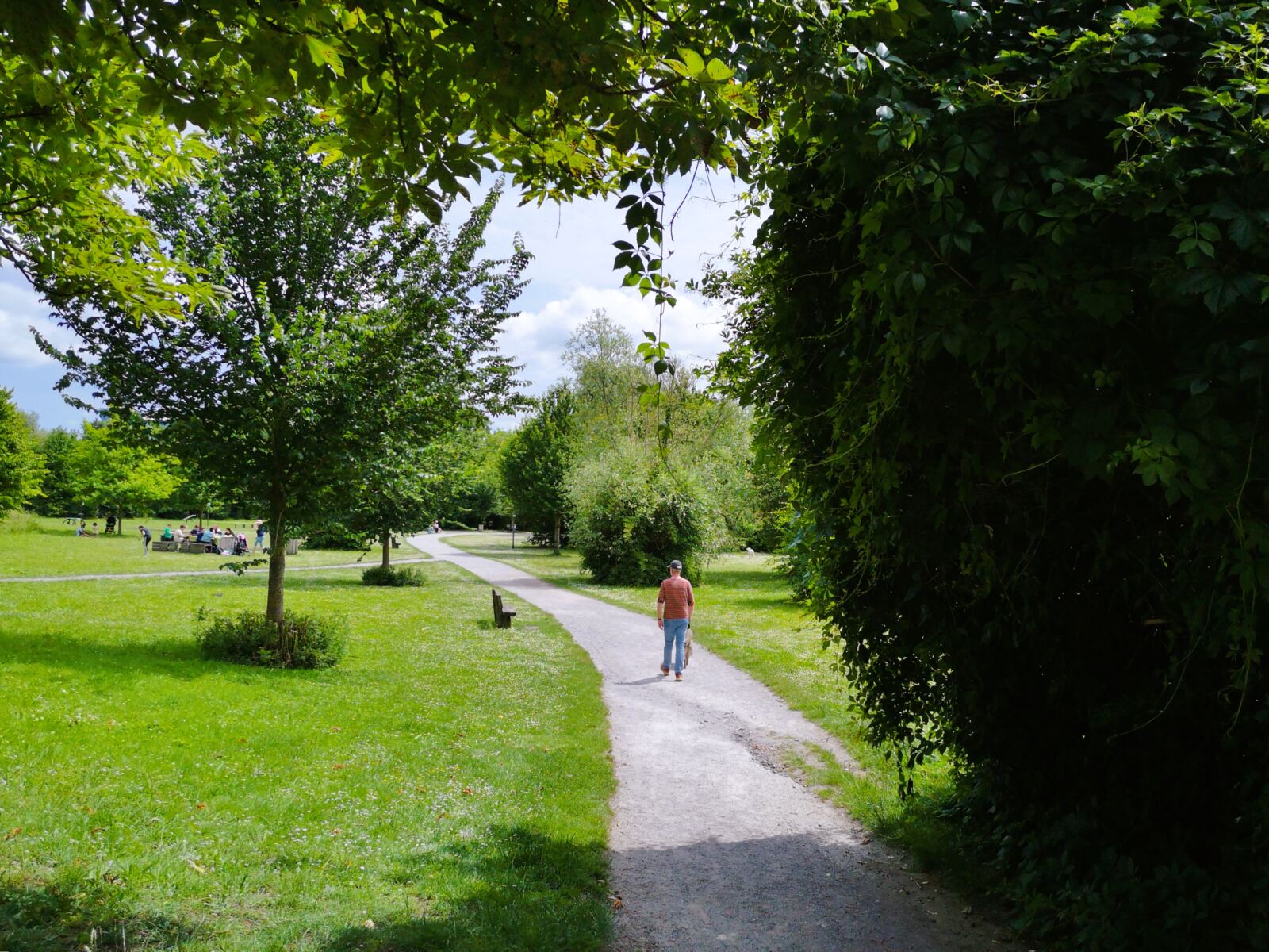 Nun betreten wir einen kleinen Park, rechter Hand der See. Geradeaus sehen wir bald die Brasserie Quai 70.