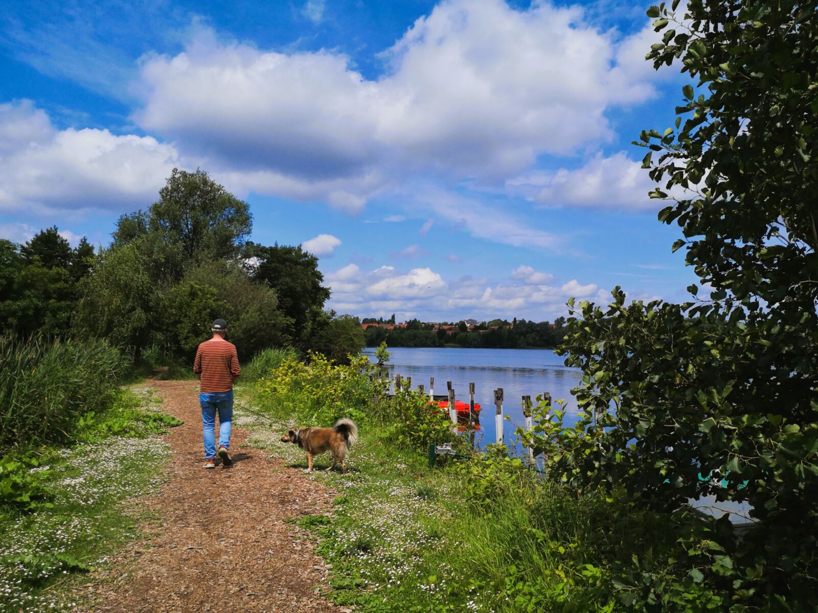 Unsere Rundwanderung auf gut befestigten Wegen lässt sich gemütlich in gut einer Stunde bewältigen. Sie ist ideal für warme Tage, denn die Strecke verläuft meist im Schatten hoher Bäume. Unser Vierbeiner kann fast durchgehend in den See springen. 🐶💦 Es gilt Leinenpflicht (an die sich längst nicht alle halten). Deshalb empfiehlt sich hier eine Flexi oder Schleppleine. 🌳☀️