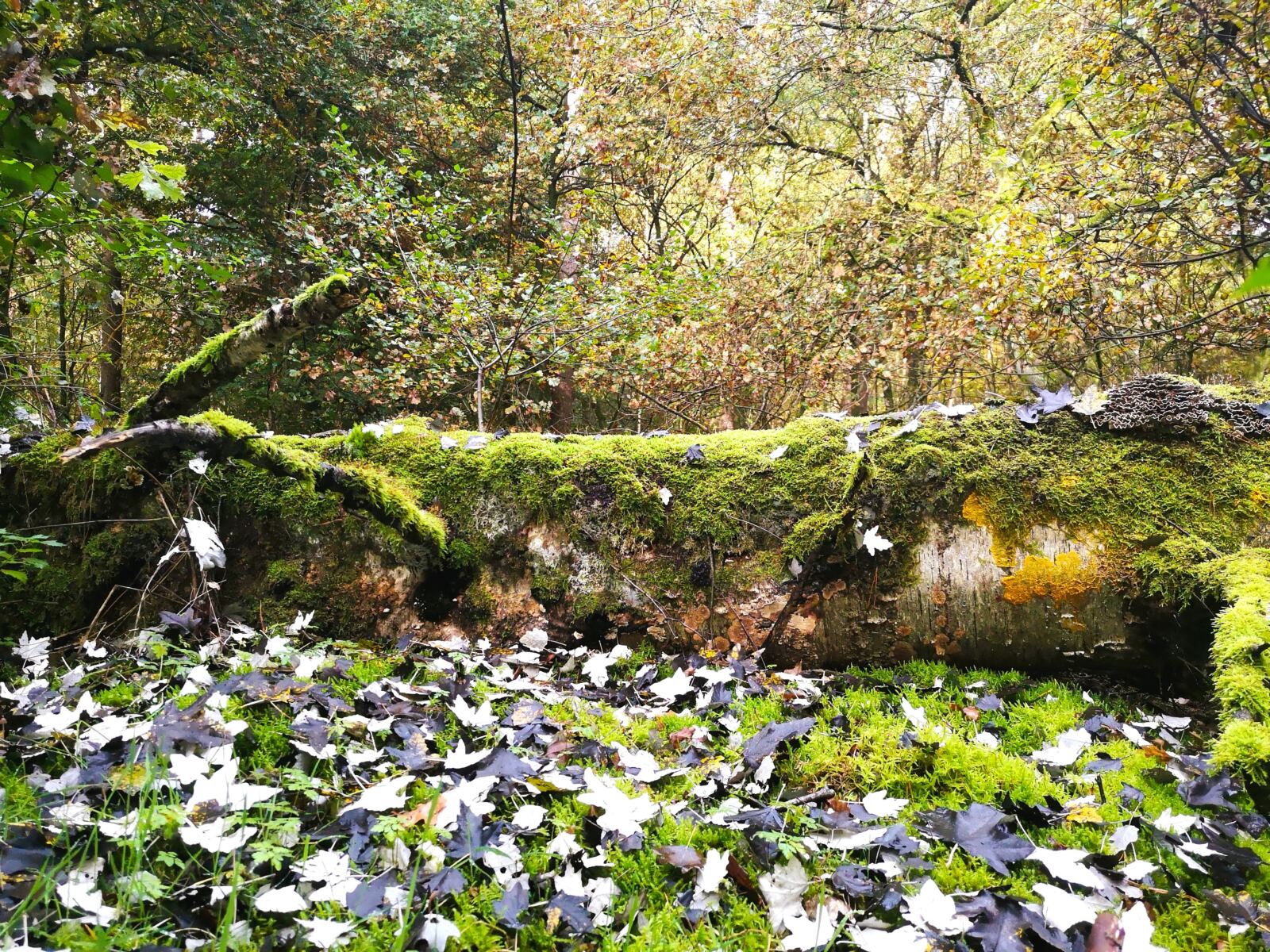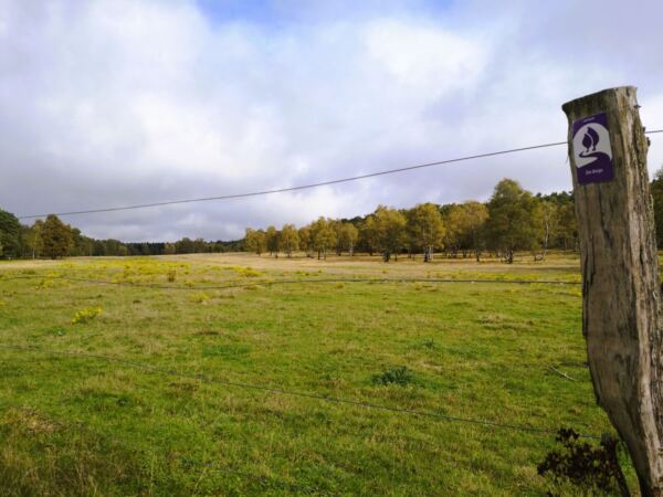 Unsere Wanderung führt uns durch den wunderschönen, lichten Mischwald der Berge und um die Naturerbefläche. 🌳🍄🟫 Wer gut hinschaut, entdeckt wohl auch sehr alte Hügelgräber aus der Stein- und Bronzezeit. Wir sind leider daran vorbeigelaufen. Der Weg ist durchgehend gut beschildert. Ein Glück, denn ohne die Wegmarkierungen – das auffällige Symbol der „Landstreifer“-Wege, zwei Bäume und ein Fluss in lila und weiß – wären wir auf der Strecke mit ihren vielen Verzweigungen ziemlich schnell verloren. An Wegkreuzungen also immer schön Augen offenhalten. Wer auf Nummer Sicher gehen will, lädt sich auch noch die GPX-Daten herunter.