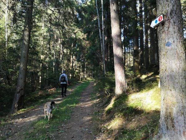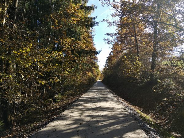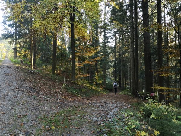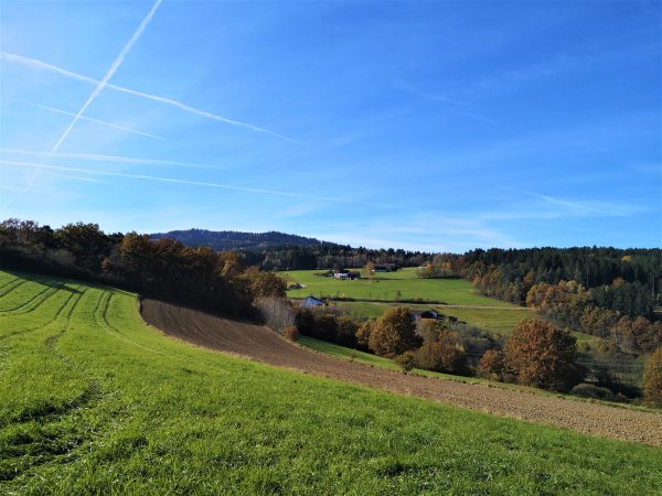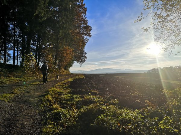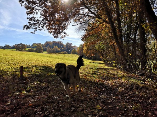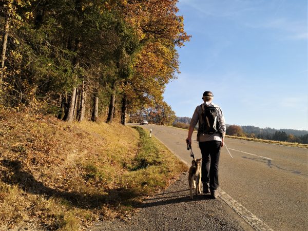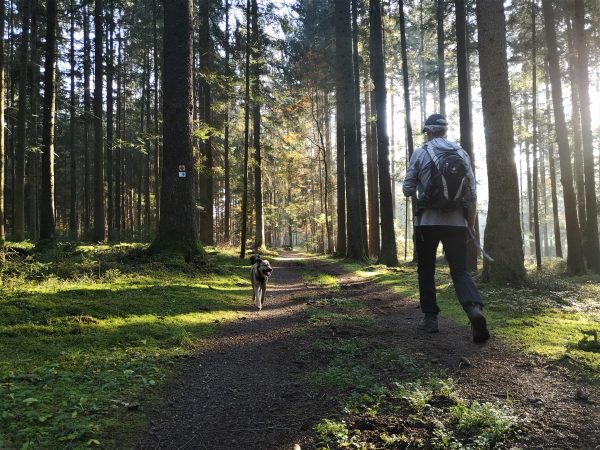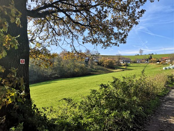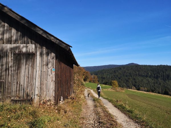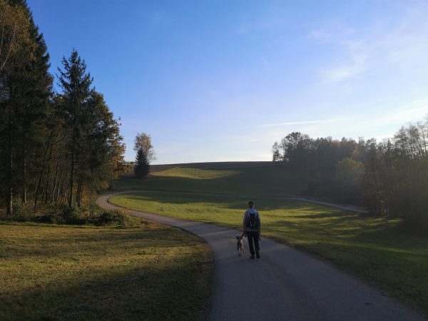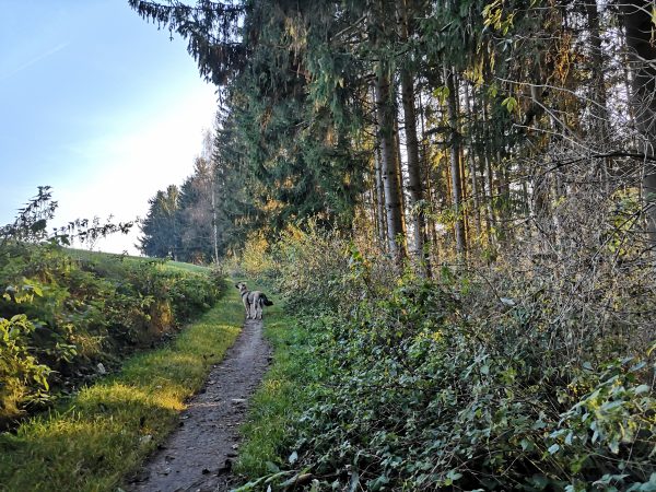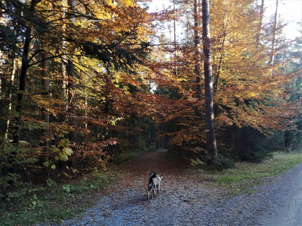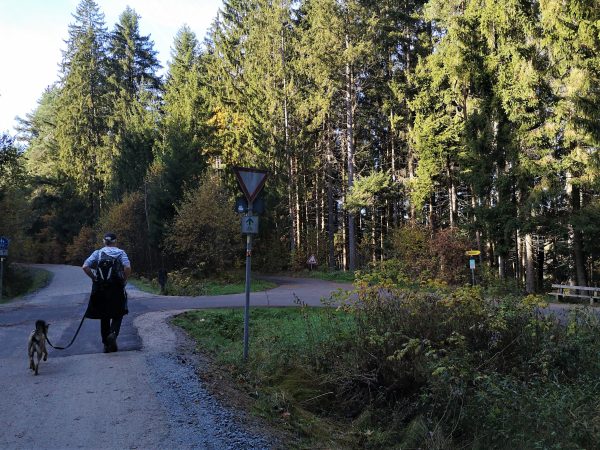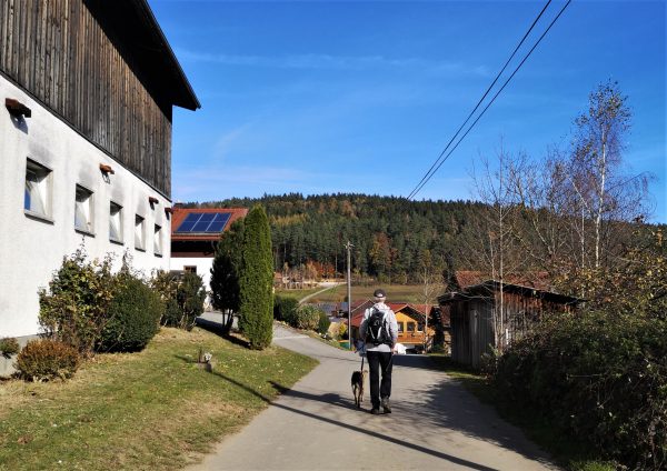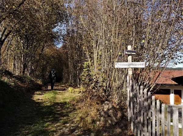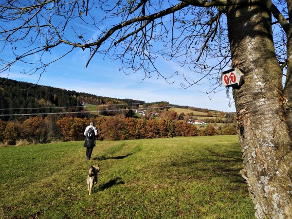 Den größten Teil der Wanderung folgen wir den Wegweisern weiße 1 in rotem Kreis. Nur zwei Mal – das 1. Mal am Bichlweg in Tresdorf, das 2. Mal in Viechtach an der Spitalkirche – verlassen wir ihn kurz, um abzukürzen bzw. um über den Stadtplatz von Viechtach zurückzulaufen und hier im Café Venus einzukehren. Geöffnete Gaststätten am Weg haben wir auf unserer Tour Ende Oktober nicht gesehen, Aber viele schöne Plätze für ein Picknick. Also Brotzeit für Zwei- und Vierbeiner einpacken.