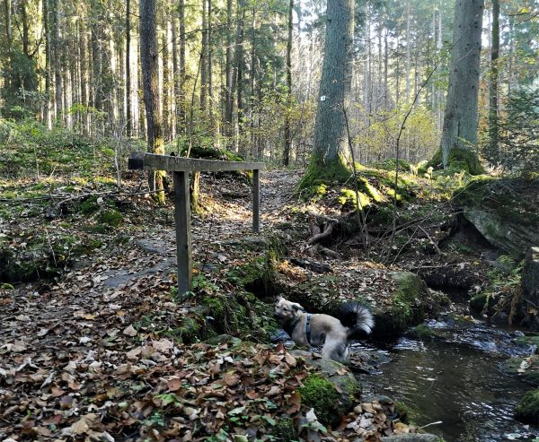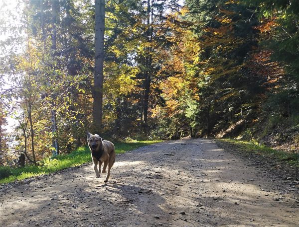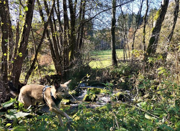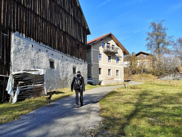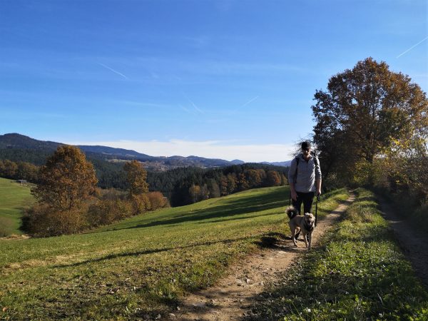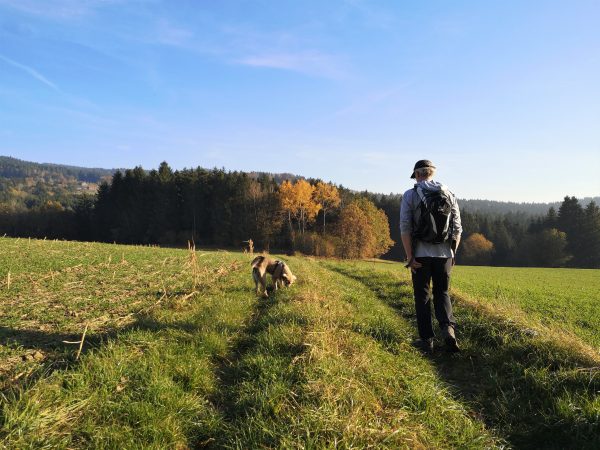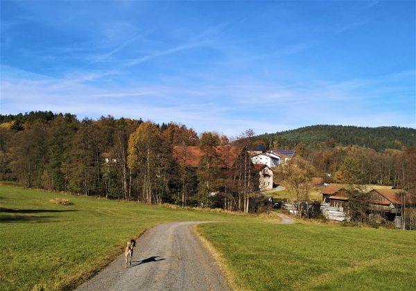 Unsere sehr abwechslungsreiche Rundtour führt über Viechtach, Wacht, Tresdorf, Steinhof und Ruhmannsdorf zum Höllensteinsee, zurück über Gröllerhaus, Pirka und Rugenmühle. Es geht durch Weiler, Wälder und Wiesen, teils mit weitem Panoramablick über die Bayerwaldberge. Unter Füßen und Pfoten: auch so ziemlich alles. Naturbelassene Wald- und Wiesenpfade, Forstwege, abschnittsweise Teerstraßen und sandgebundene Wege. Minuspunkt: Kurze Strecken müssen wir auf – allerdings wenig befahrenen – Straßen ohne Bürgersteig laufen sowie zwei längere Etappen auf einem Weg zurücklegen, den sich Radler und Fußgänger teilen. Hier gehört der Hund natürlich an die Leine. Gut zu verkraften, weil sich der Wauzi über weite Strecken leinenfrei auspowern kann. Und hin und wieder kann er auch in Bächen planschen.