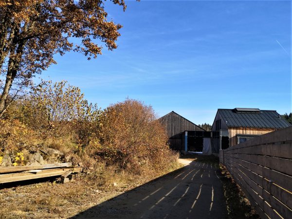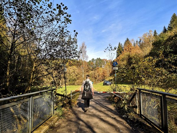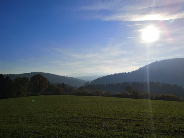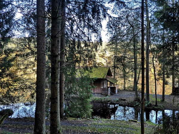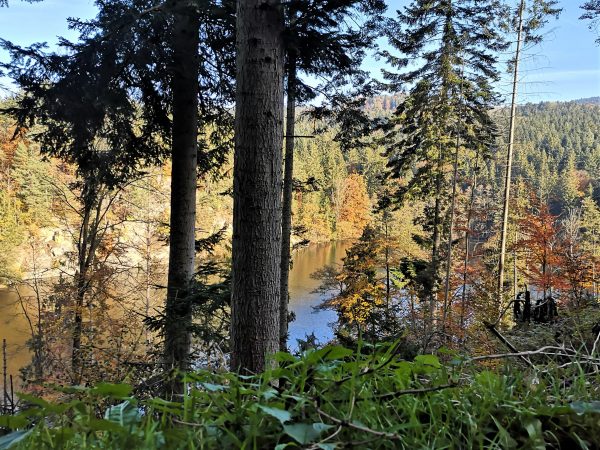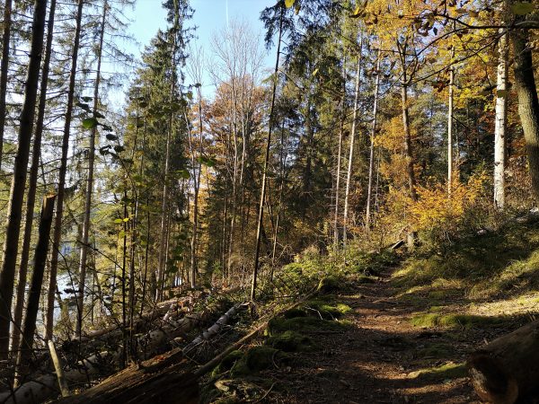Weiter geht es vorbei an Wiesen mit Weitblick, hinein und hinunter durch den Wald und immer weiter auf diesem Forstweg bis zum Höllensteinsee. Wir queren den See über das Wehr, laufen am See entlang und rechts ab wieder in den Wald hinein. Über Wurzelpfade geht es am See entlang und bergauf. Über einen Wiesenpfad erreichen wir die Regionalstraße 17. Wir biegen rechts ab und laufen ein kurzes Stück auf der Straße. Hinter dem Parkplatz queren wir die Straße und biegen rechts ab. Über ein Feldweg erreichen wir den Wald. Es geht bergab und über einen Fluss, dann wieder hinauf. Nach einigen hundert Metern biegen wir rechts ab vom Forstweg auf den Wanderweg. Immer der 1 folgend erreichen wir das Gut Gröllerhaus auf einer Waldlichtung. Danach halten wir uns bald links den Berg hinab, vorbei am Fluss, wieder links hinauf, dem Teerweg folgend. An jeder relevanten Kreuzung finden wir nun die weiße 1 im roten Kreis. Sie führt uns am Ortsrand von Pirka vorbei und weiter auf den Wanderweg oberhalb des Schwarzen Regens Richtung Viechtach.