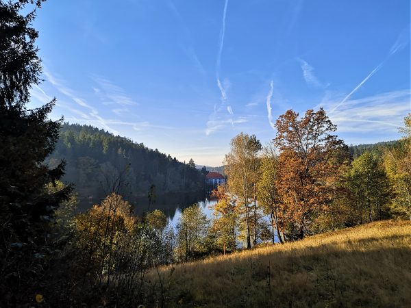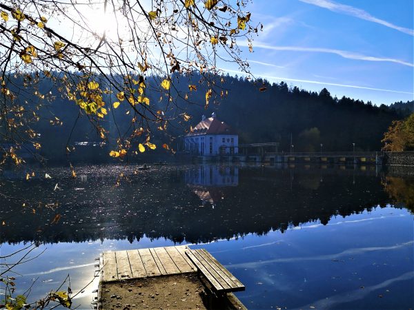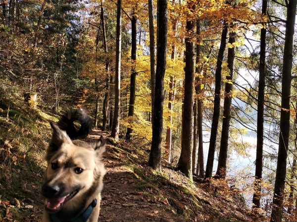 Zwischen Viechtach und Bad Kötzting im Naturpark Bayerischer Wald liegt der Höllensteinsee. Der entstand, als mit dem Bau des Höllenstein-Kraftwerks in den 1920er Jahren der Schwarze Regen auf rund 6 Kilometern aufgestaut wurde. Im Goldenen Herbst ist es hier besonders schön. Dunkles Wasser im tiefen Tal, eingerahmt von Mischwald, der von goldgelb bis blutrot leuchtet. Das erinnert an Kanada. Wir waren begeistert – und unser Amos auch. 🤩🐶