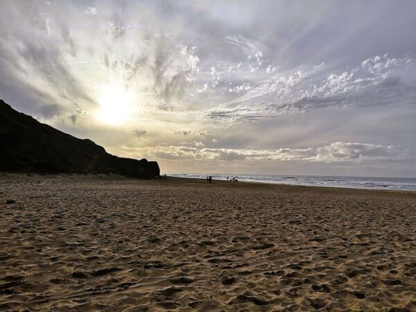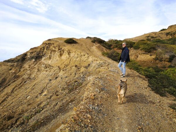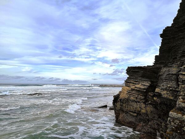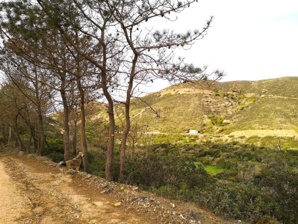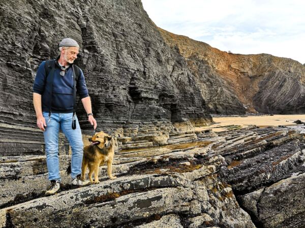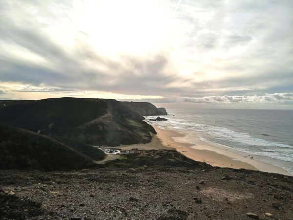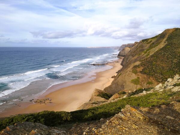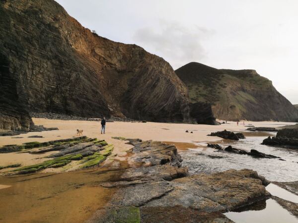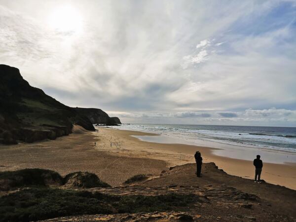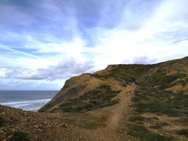 Unsere Wanderung zwischen dramatischer Küste und kargem, windgepeitschtem Hinterland bietet gigantische Tiefblicke vom Klippenpfad auf die Praia do Cordoama, die Praia da Barriga und die Praia do Castelejo. Die Buchten sind eingefasst von markanten Felsformationen aus Sandstein, Schiefer und Quarzit, die alle Schattierungen zwischen hellem Ocker und rauchigem Schwarz zeigen. Geologische Wunder, von der Erosion geformt. Bei Ebbe sind alle drei Buchten durch einen scheinbar endlosen Strand miteinander verbunden. Ideal für den Rückweg. Die Praia do Cordoama, ein beliebter Surf Spot, ist in der Saison bewirtschaftet, der Strand für Hunde verboten. Außerhalb der Saison sind die Surfer*innen noch immer hier. Doch das Hundeverbot kümmert dann niemanden mehr. Wir haben hier zum Beispiel die Unterstützer*innen eines privaten Tierheims getroffen, die mit einem ganzen Rudel über den Strand spaziert sind. 😄🐕🌊