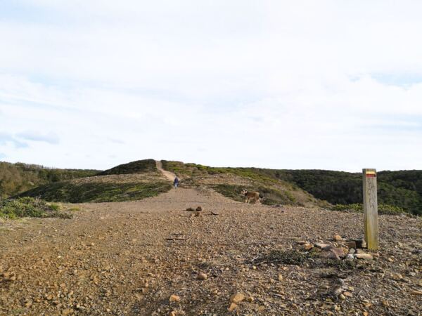 Unser – gelb-rot markierter – Pfad wendet sich von der Küste ab Richtung Landesinnere. Wir folgen ihm immer geradeaus, zunächst kauf merkbar bergauf, dann weitgehend eben. Der holprige Weg mündet auf einen breiten steinigen Sandweg. Wir halten uns links und folgen dem Weg in Schleifen bergab Richtung Tal und in die imposante Praia da Barriga mit ihren zackigen, schieferschwarzen Felswänden.