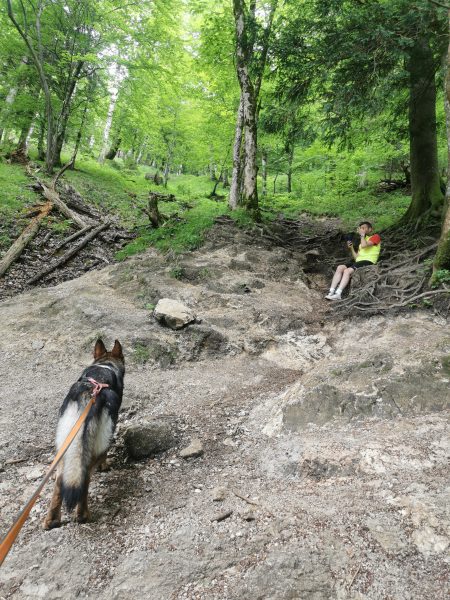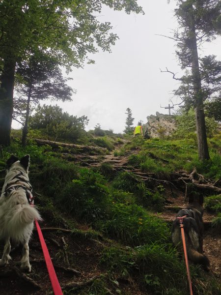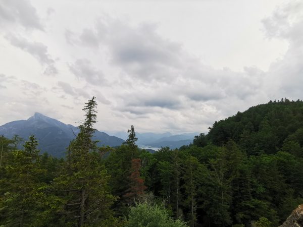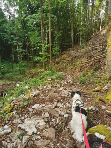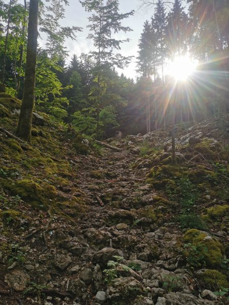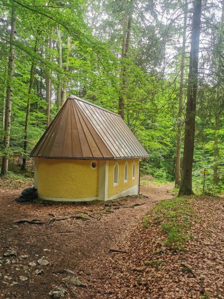 Nach dem Örtchen Gries folgen den Schildern Richtung Almkogel. Dabei kommen wir an der Tgeklakapelle vorbei. Anfangs geht es einigermaßen entspannt durch einen schönen Wald, dann geht es in Serpentinen wirklich steil bergauf. Auf 2,5 km machen wir 600 Höhenmeter. Der Weg ist schmal und von Wurzeln durchzogen; man sollte wirklich trittsicher sein!