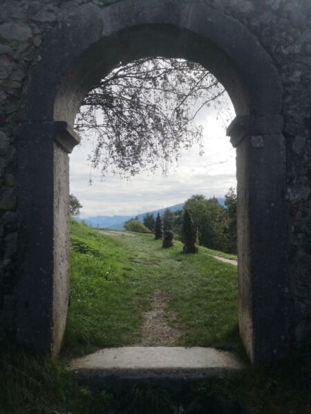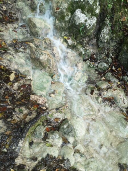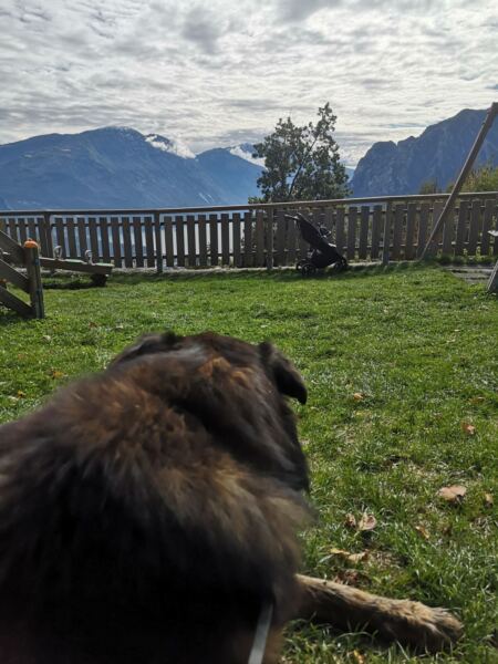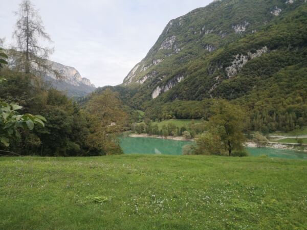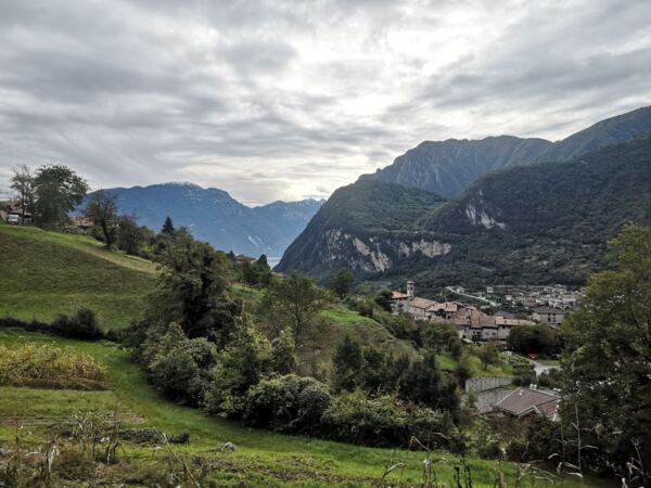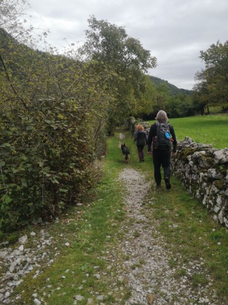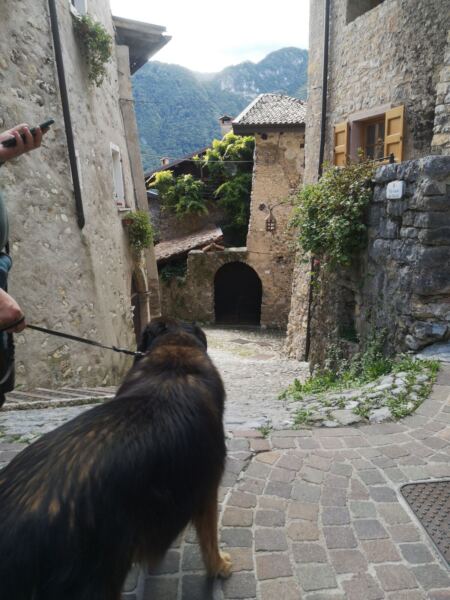 Diese Wanderung startet am Lago di Tenno. Zuerst mit Blick auf den See, dann zwischen Ferienhäusern hindurch. Kurz vor Canale biegen wir links ab. Ab jetzt geht es im Schatten hoher Bäume bergauf. Wir sind Anfang Oktober unterwegs und können somit nichts über die Sommerzeit sagen. Bei unserer Wanderung fließen aber immer wieder kleine Bäche über den Weg, die die Hunde für kleine Trink- und Badepausen nutzen.