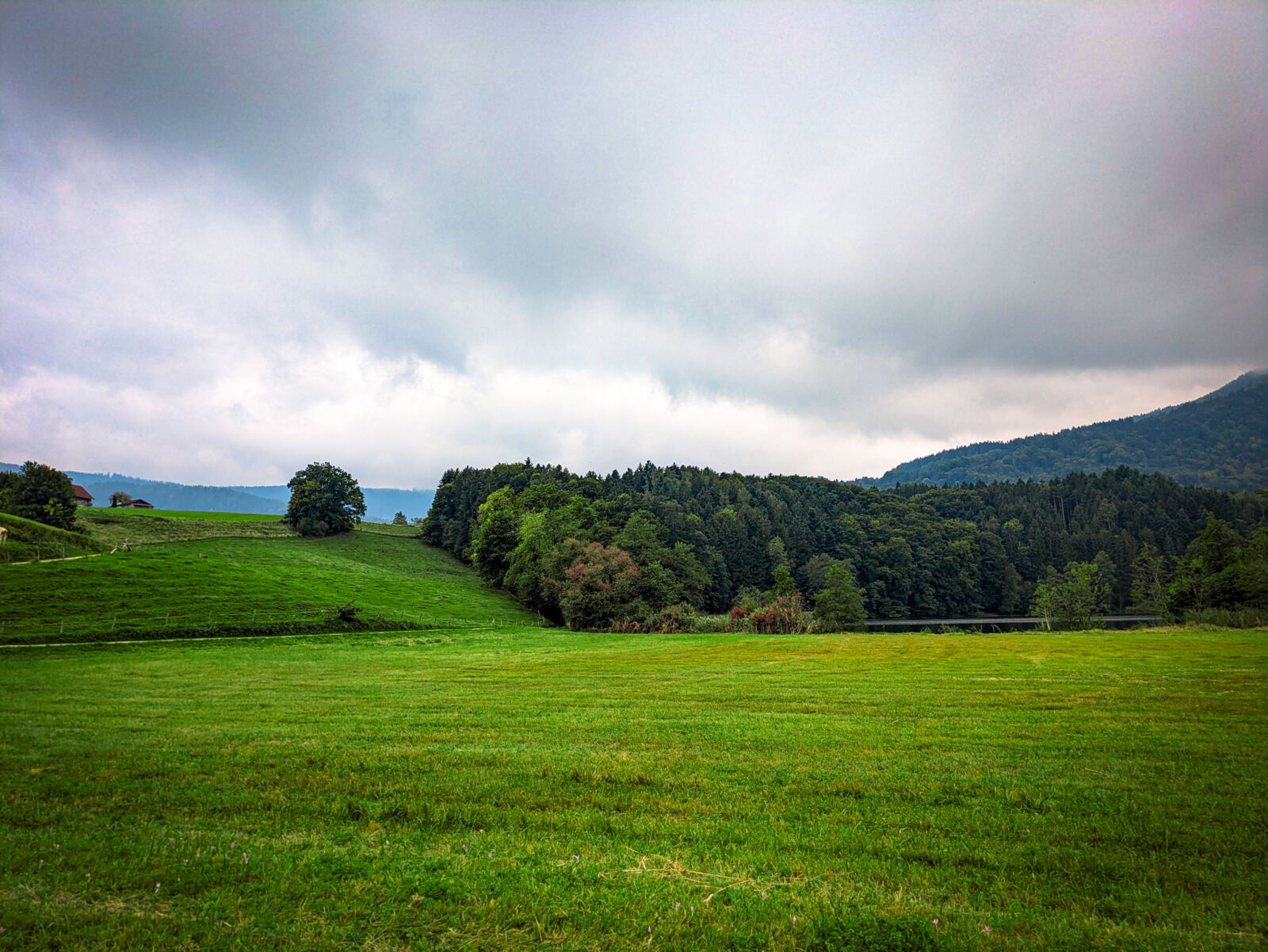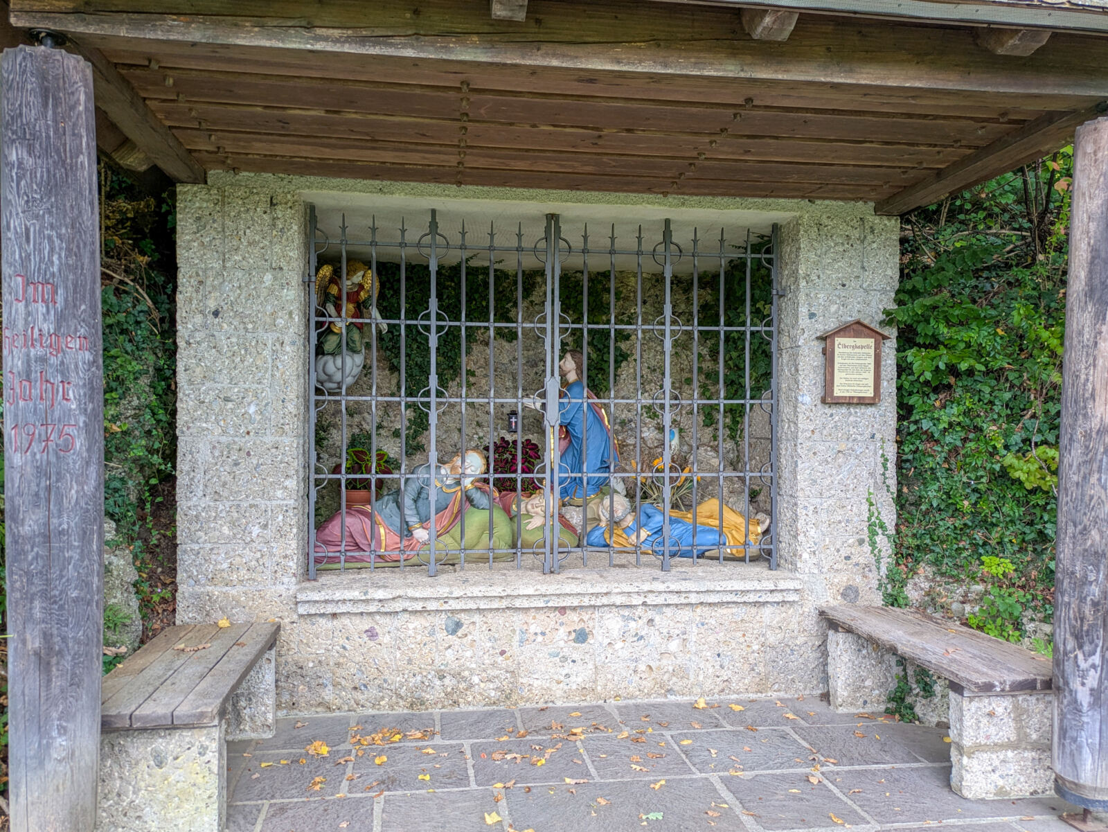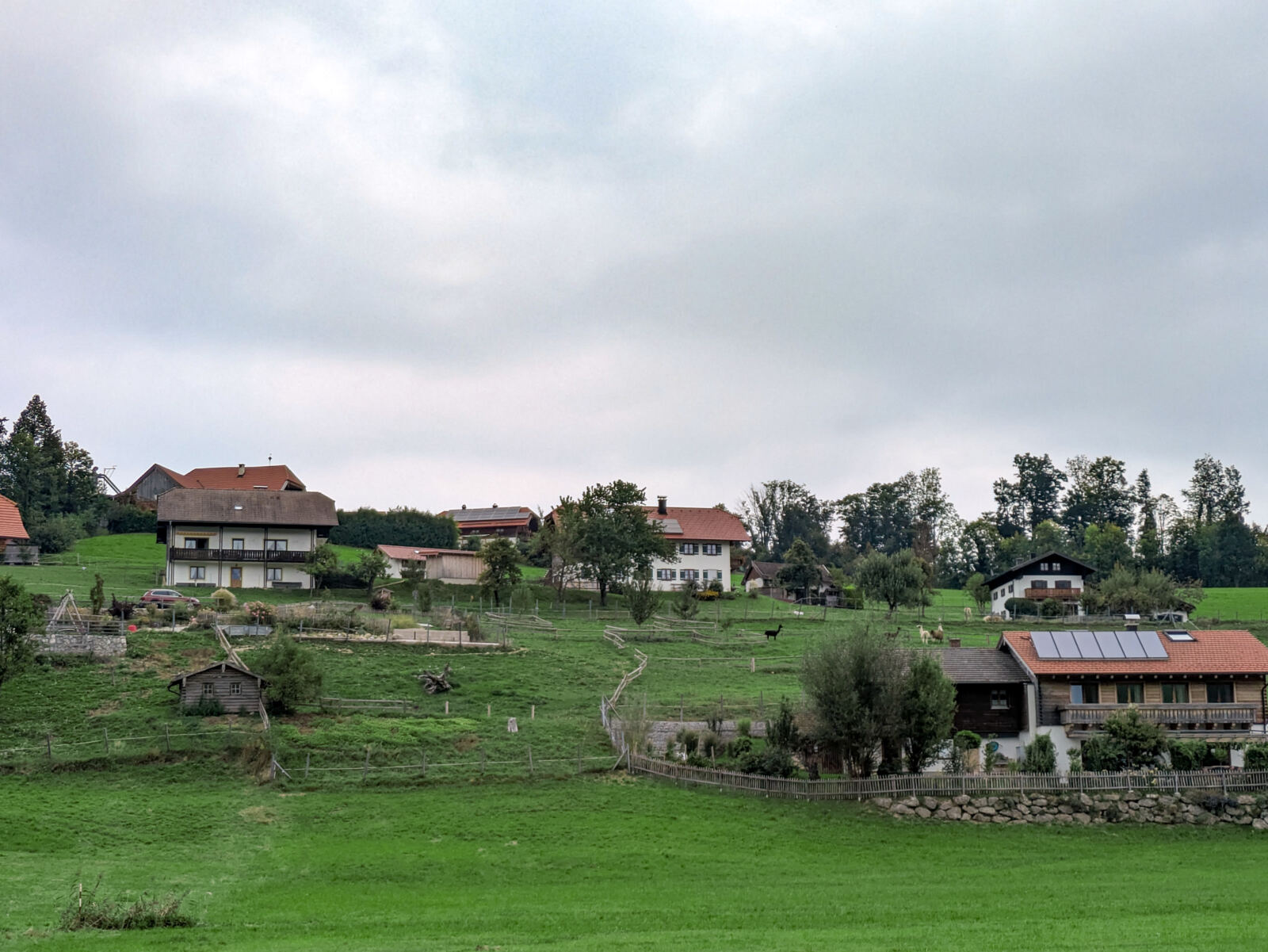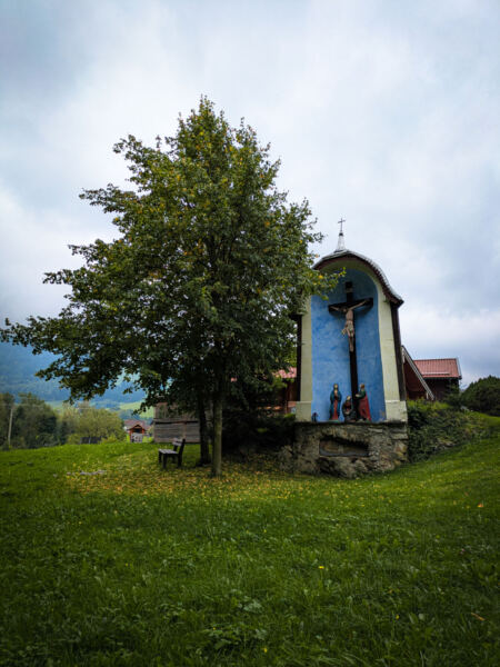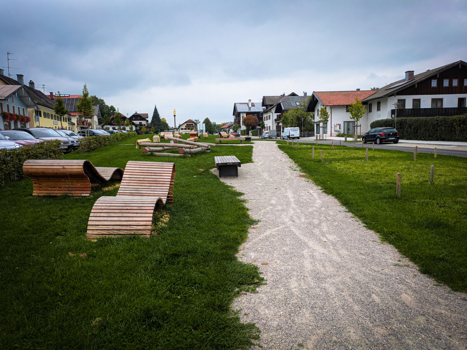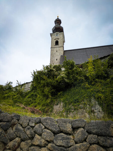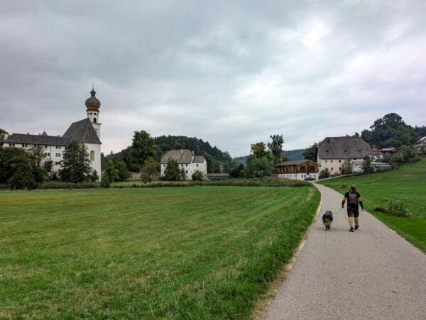Wir starten am hübsch herausgeputzten Dorfplatz von Anger, an dem auch die weithin sichtbare Pfarrkirche Maria Himmelfahrt aus dem 15. Jahrhundert steht. Von Anger aus gehen wir uns über den Klosterweg nach unten, damit gehen wir auch einen kleinen Abschnitt des voralpinen Jakobswegs. Die Straße ist asphaltiert, aber bis auf den ersten kurzen Abschnitt nur für Anwohner freigegeben.