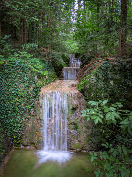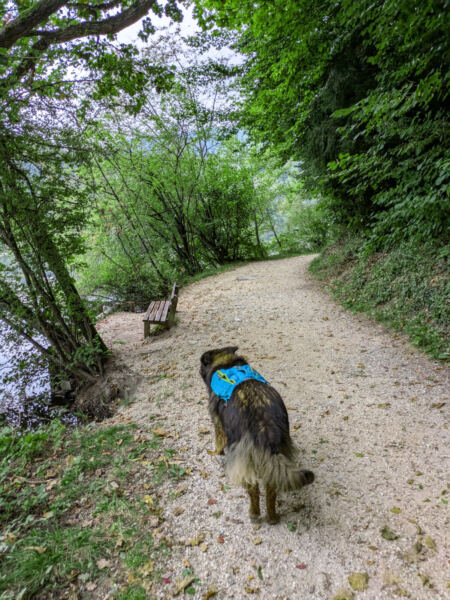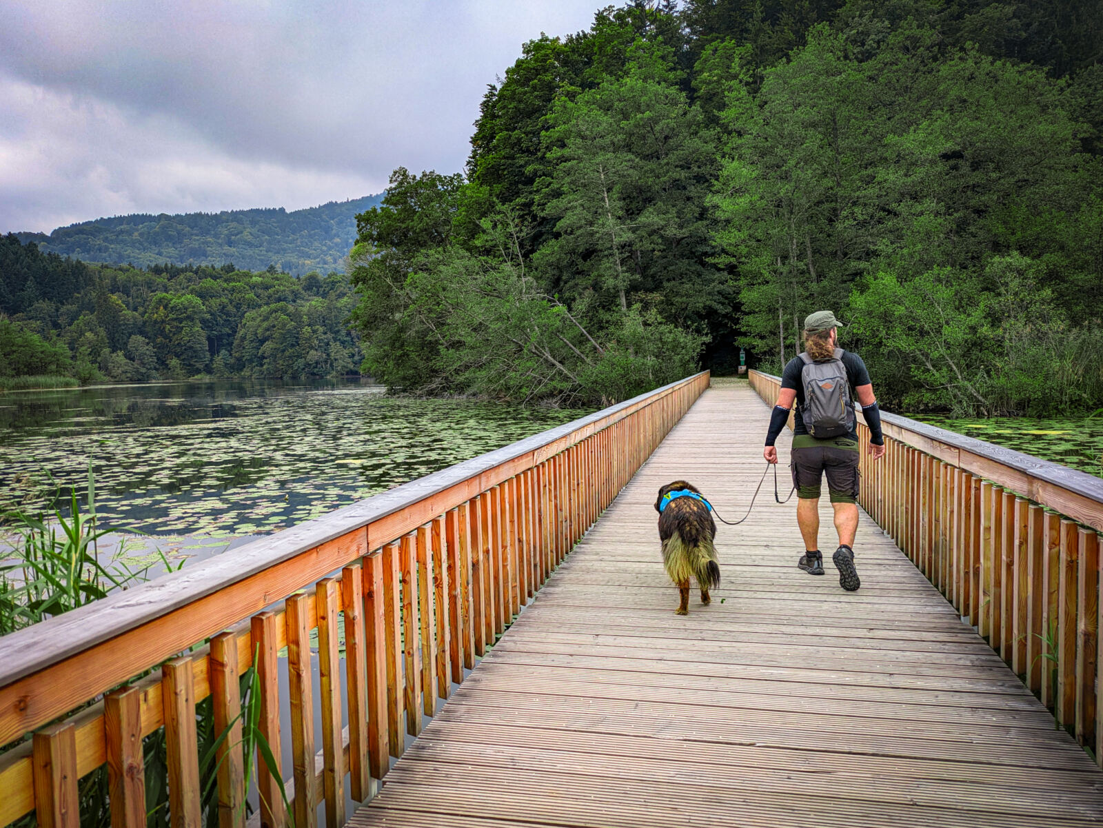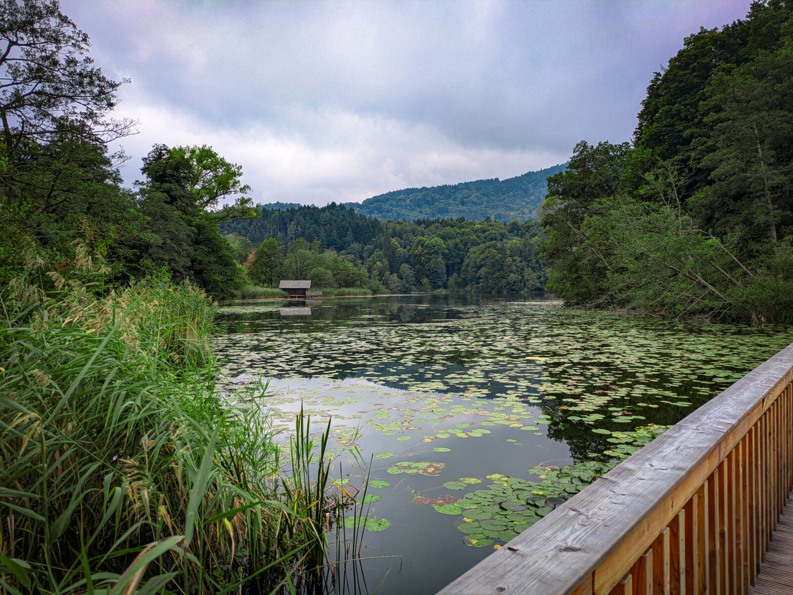 Vom Parkplatz des Gasthauses aus führt eine Brücke auf den Seenrundweg. Hier gibt es den ersten von vielen tollen Ausblicken über den See. Der Weg führt direkt am Ufer entlang, zwischen Wasser und dichtem Wald. Etwa zur Hälfte unserer Runde führt eine kleine Wasserfallkaskade zum See.