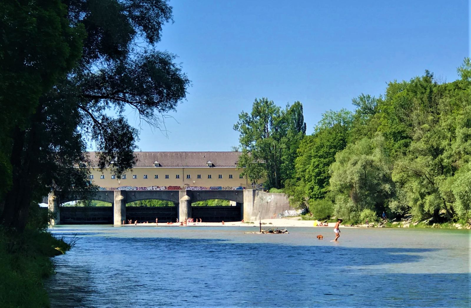 Das Wehr staut die Isar rund 6 Meter hoch auf und leitet einen Teil des Wasers in den Mittlere-Isar-Kanal. Das imposante Gebäude, errichtet in den 1920er Jahren, erinnert mehr an ein herrschaftliches Wohnhaus als einen Zweckbau. Kaum zu glauben: Früher stand am selben Ort die kleine Villa der Fährmannsfamilie Blumenthaler, die Passant*innen mit ihrer Drahtseilfähre von Bogenhaus nach Schwabing übersetzte. Wir laufen über den breiten Gehweg am Wehr entlang über die Isar. Im Sommer sind die Kiesbänke unter dem Wehr ein beliebter Badeplatz.