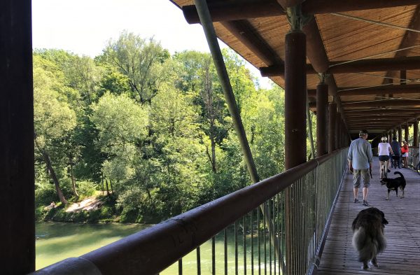 Auf der Insel traben wir im Schatten von Laubbäumen am Wasser entlang. Die Sonne malt Lichtpunkte auf unseren Weg. Immer wieder treffen wir auf entspannte Vierbeiner mit ebensolchem Anhang. Schließlich erreichen wir die Fischtreppe am Stauwehr Oberföhring. Gut 100 Jahre stellte die Staustufe ein unüberwindbares Hindernis für alle Fische dar, die zur Paarungszeit die Isar hinaufziehen. Heute können Huchen, Nasen und viele andere ungehindert der Liebe folgen. 💕