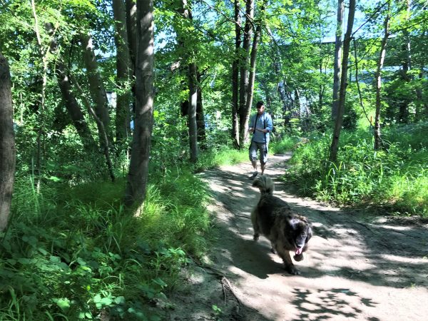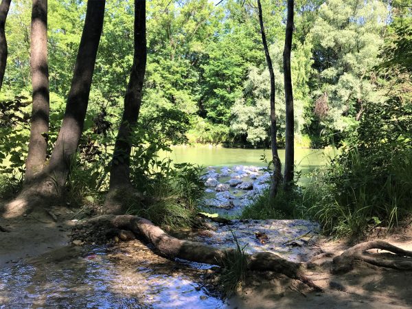 Hinter dem Wehr halten wir uns links, dann geradeaus, denn wir wollen dem Mini-Hofbräuhaus – unter Hundeleuten besser bekannt als „Hundehofbräuhaus“ – noch einen Besuch abstatten. Danach geht es durch den Nordteil des Englischen Gartens, in dem freilaufende Hunde geduldet sind, am Oberstjägermeisterbach zurück.