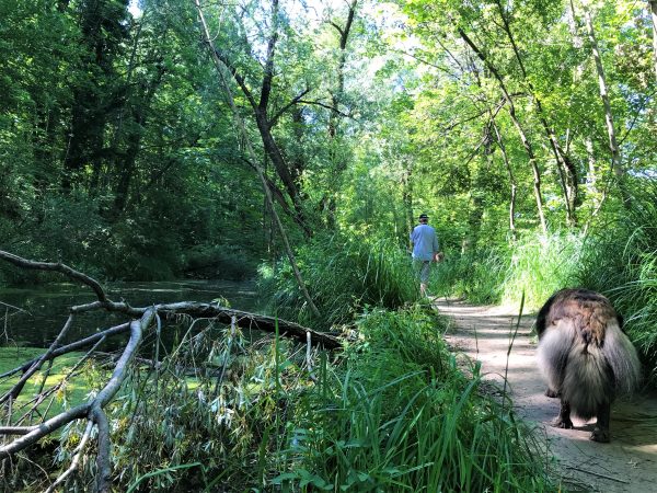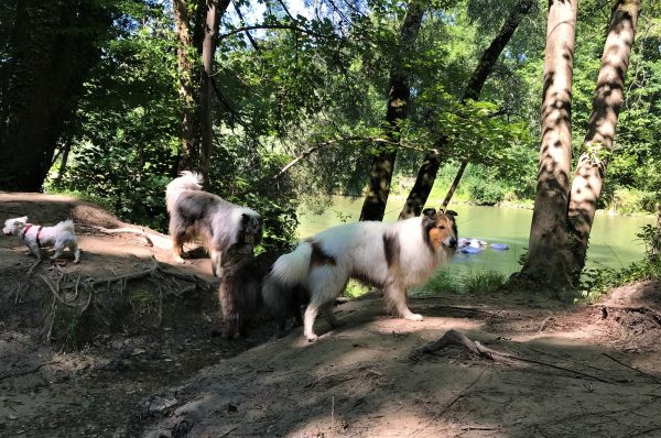 Entlang der Isar präsentiert sich die Insel besonders lauschig. Der schmale, sandige Fußpfad verläuft unter einem Blätterdach. Immer wieder kreuzen – mal gezähmte, mal frei fließende – Wasserläufe den Weg. Streckenweise erhebt sich Schilf aus dem Nichts, dahinter liegen tiefe Tümpel, in denen Totholz dümpelt. Im Sommer begegnen uns hier viele „panierte“ Hunde, die sich nach einem Bad im Fluss im feinen Sand gewälzt haben – und dann gerne die Picknick-Decke ihrer Halter*innen einsauen. 💧🐶 Es macht einfach Spaß hier, gerade an einem heißen Sommertag. Und selbst am Wochenende findet sich immer ein ruhiges Plätzchen für einen entspannten Badetag mit Hund.