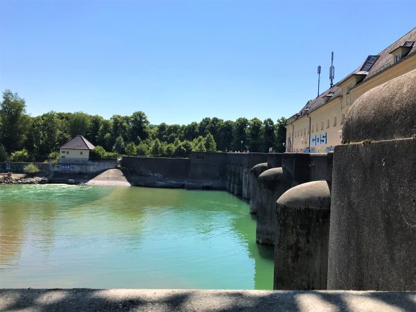 Gewaltiger Bau: das Stauwehr. Vor wenigen Jahren wurde hier eine Fischtreppe angelegt, damit Fische wie der Huchen ("Donaulachs"), Kleinkrebse und andere Wasserbewohner die sechs Meter Fallhöhe des Wehrs überwinden können.