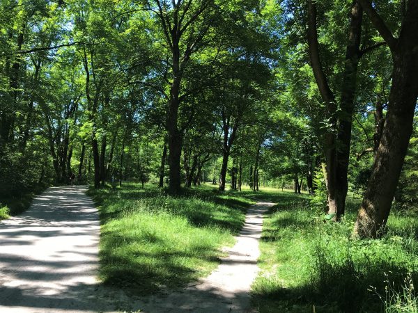 Auf dem Rückweg durch den Englischen Garten haben wir die Wahl zwischen Fußweg und Reitweg, beide unter mächtigen Bäumen.