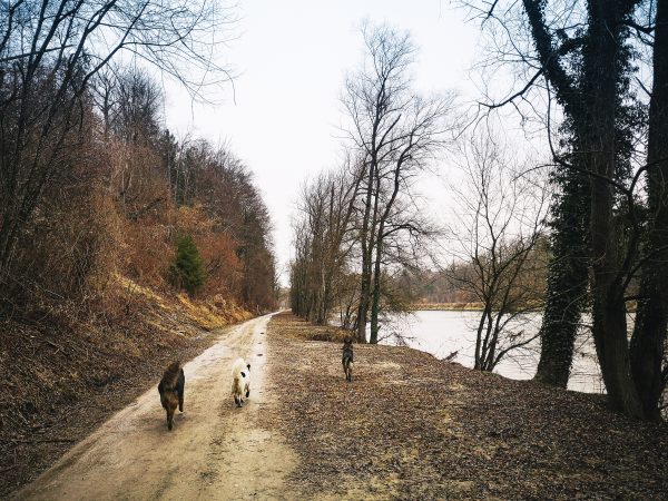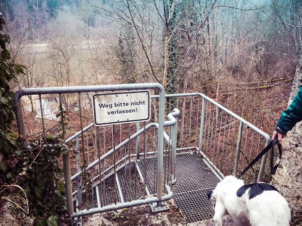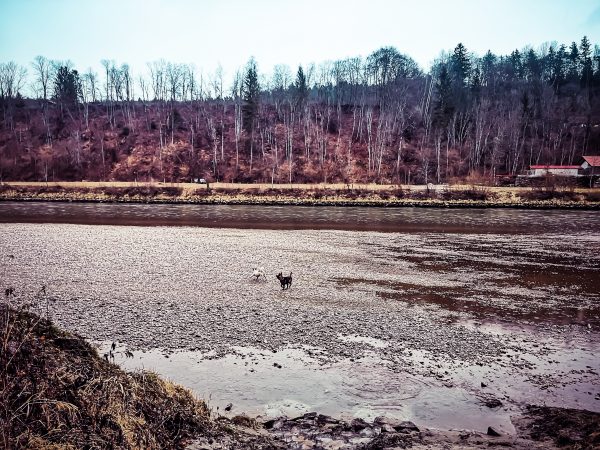 Jetzt laufen wir geradeaus an der Salzach entlang, die Hunde haben regelmäßig Gelegenheit zum Baden, wir genießen die Natur. Rechts die Salzach mit weiten Ausblicken, links der bewaldete Hang, aus dem immer wieder kleine Quellen sprudeln.
