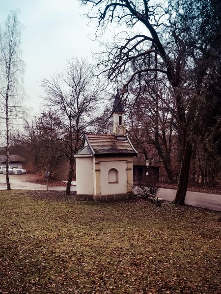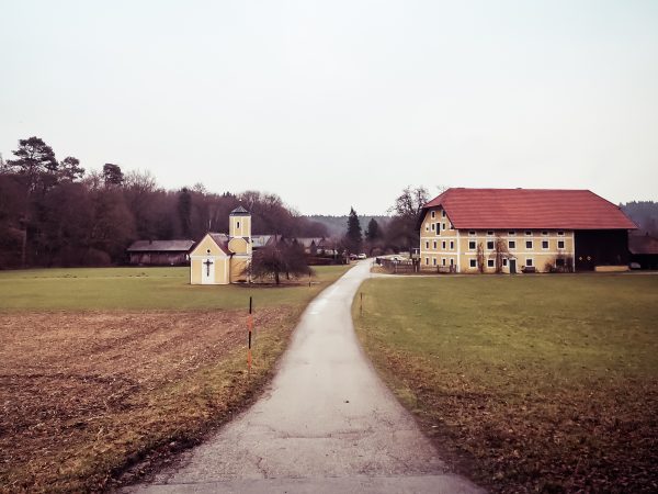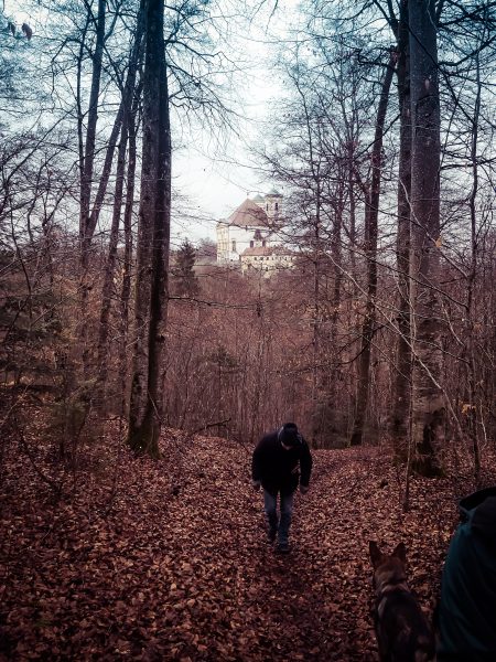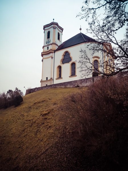 Wir starten am Parkplatz der Wallfahrtskirche Marienberg, die als eine der schönsten Rokoko-Kirchen Bayerns gilt. Von dort geht es bergab, über die Straße und dann auf einem schmalen Pfad in den Wald. In diesem bleiben wir bis kurz nach Oberhardermark: Da treffen wir auf die Bundesstraße, überqueren diese und folgen jetzt einer asphaltierten Straße. Während unserer Tour sind wir hier keinem Auto begegnet.