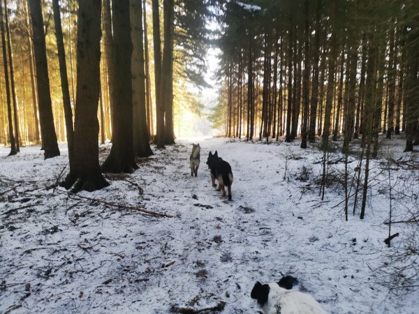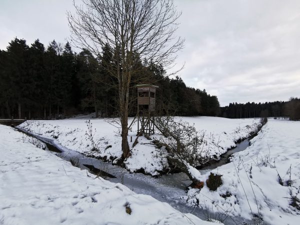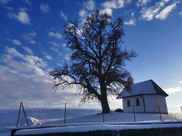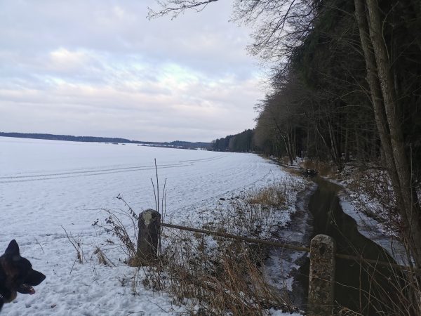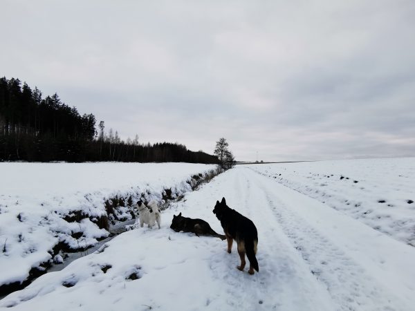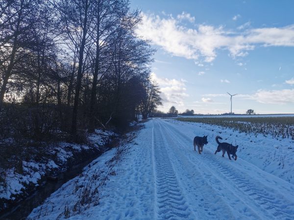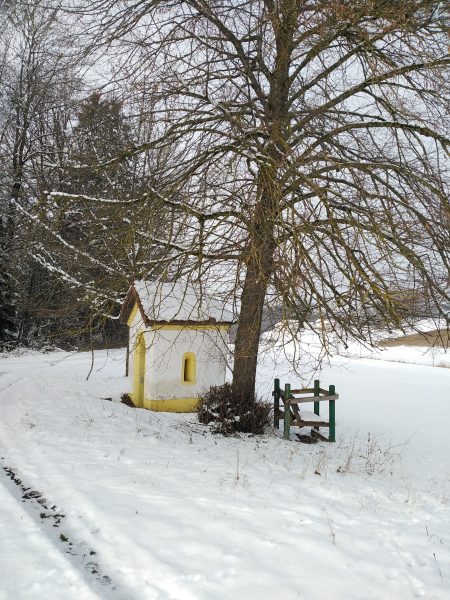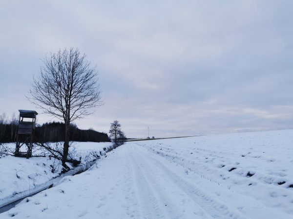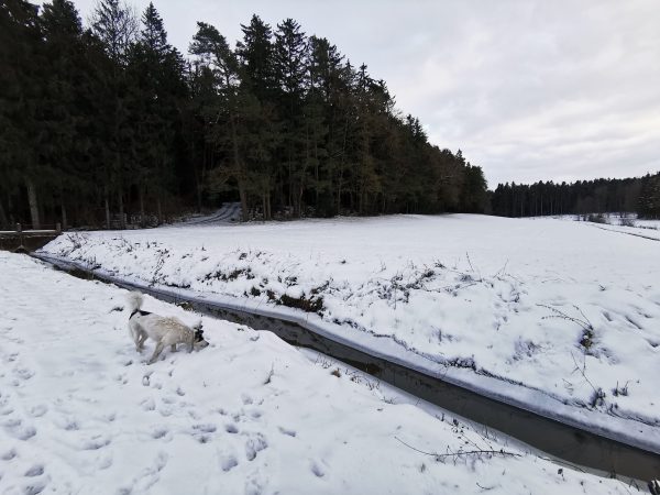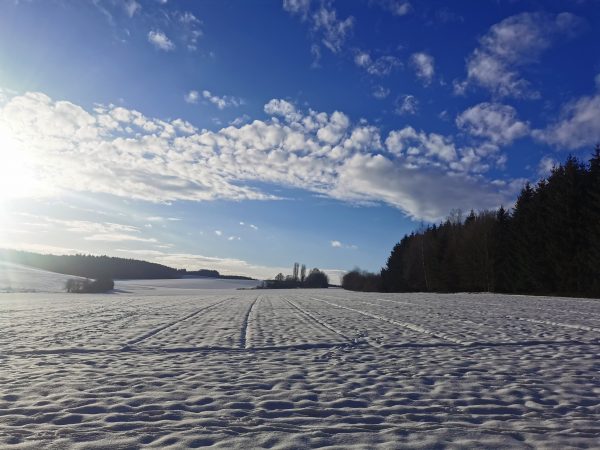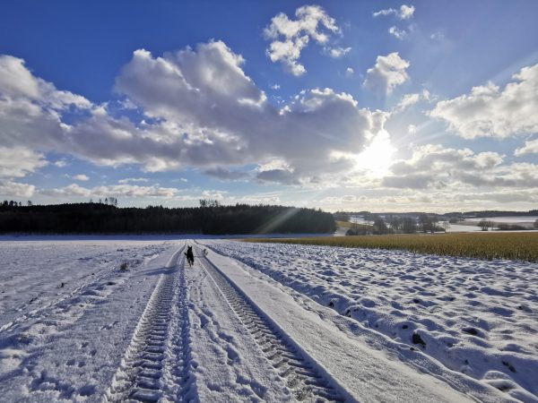 Spaziergang durch Wiesen, Felder und Wälder. Da es zum größten Teil Feldwege sind, war das Stapfen durch den Schnee ziemlich anstrengend – das nächste Mal gehen wir wieder, wenn weniger Schnee ist! Da die Gegend hügelig ist, könnte ich mir vorstellen, dass viel Regen die Wege sehr matschig werden lässt.