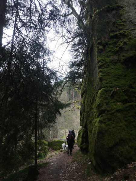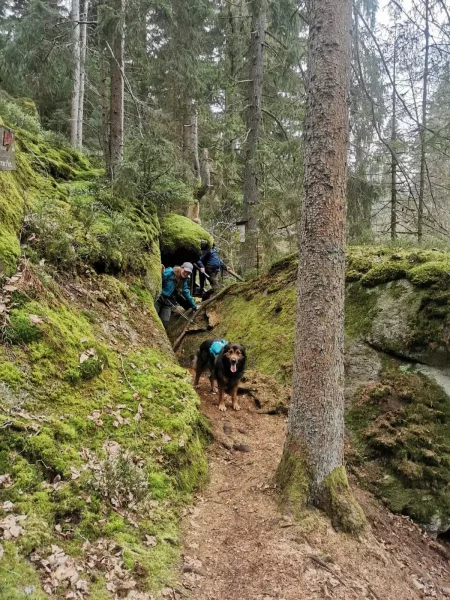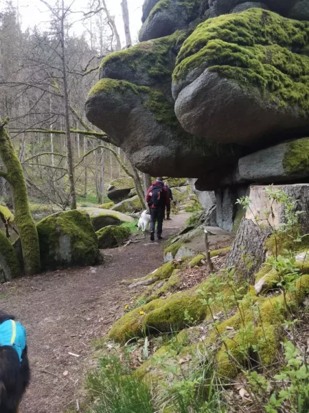 Dann geht es weiter an der Waldnaab entlang, jetzt parallel zum Goldsteig auf der anderen Flussseite über einen Naturpfad. Der Pfad ist wurzeligen und schmal und führt durch eine beeindruckende Landschaft, voller hoher Felsen.